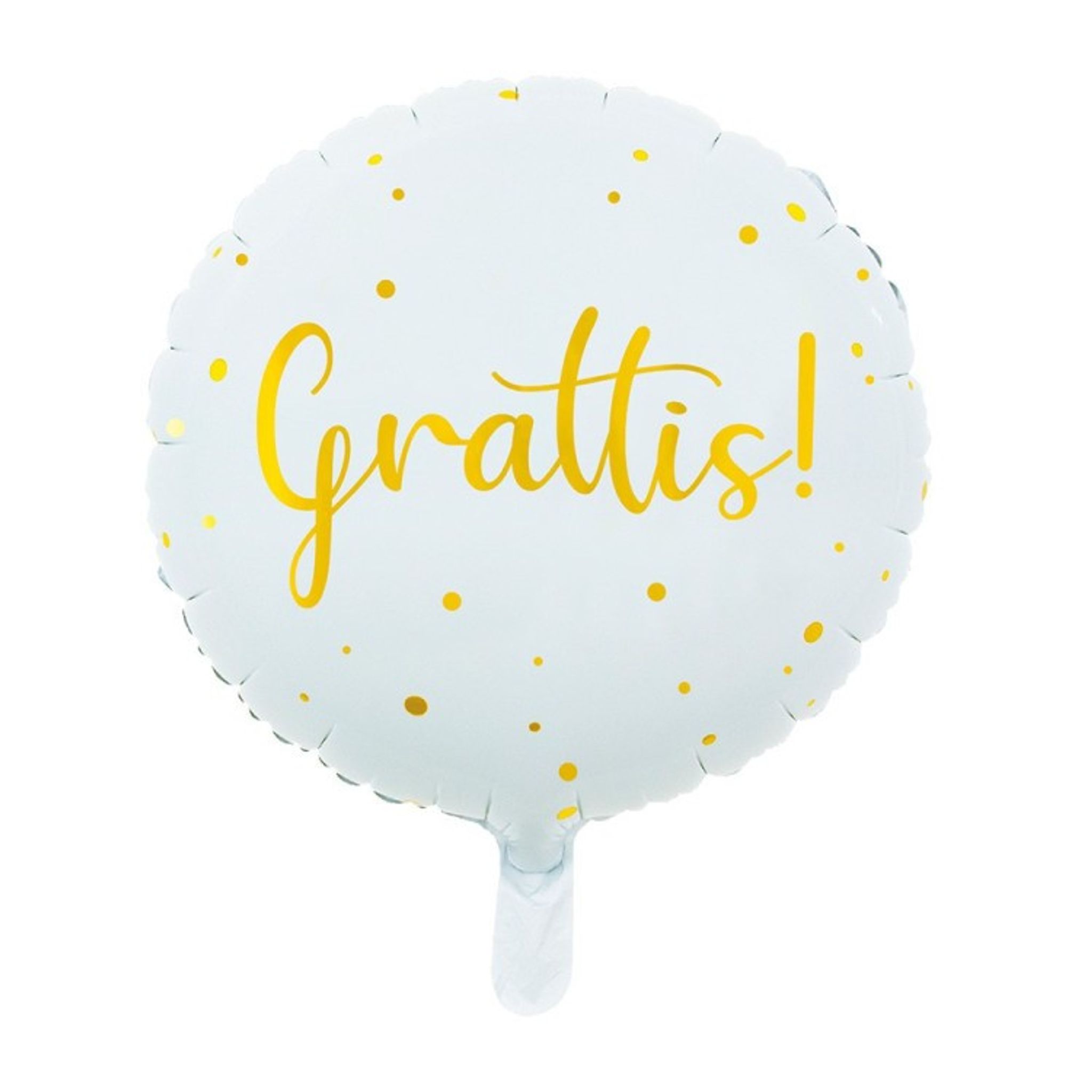 Fira födeledagsbarnet eller den nyblivne studenten rejält med snygga festdekorationer. Vad passar då bättre än en vit folieballong med guldig text "Grattis!"? Folieballongen är rund, med guldiga prickar. Snygg att kombinera tillsammans med andra ballonger, kalasdekorationer eller dukningsprodukter i samma färg, för en snygg helhet.