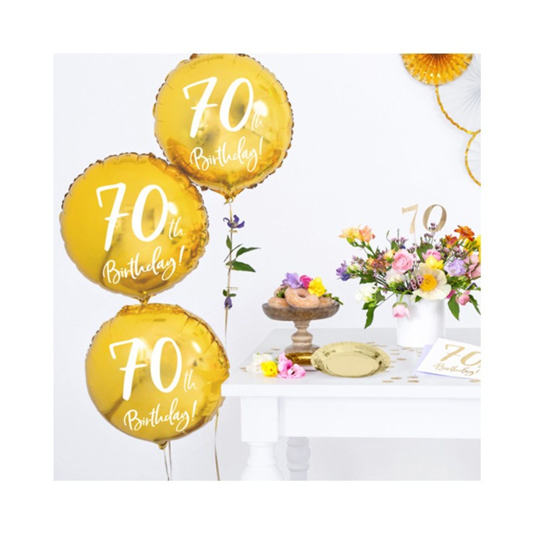 Ballongen är rund, i en härlig guldfärg och har texten "70th Birthday!" i vitt.