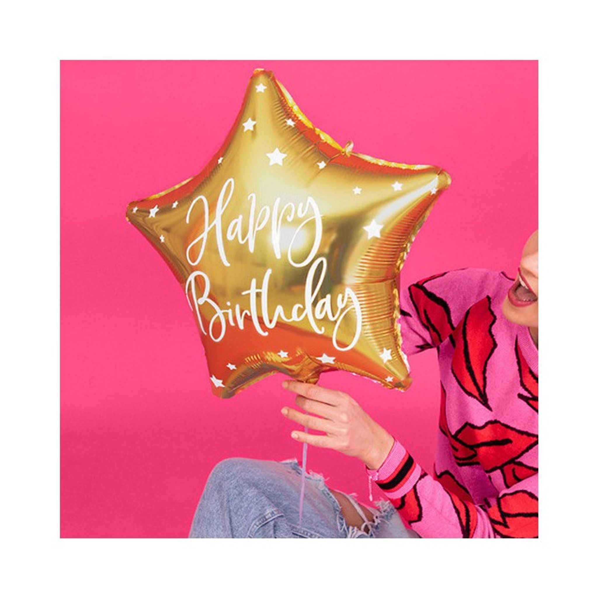 Snygg folieballong i form av en guldig stjärna med texten Happy Birthday i vitt. Perfekt att ge som en gåva till födelsedagsbarnet eller använda som dekoration på festen.