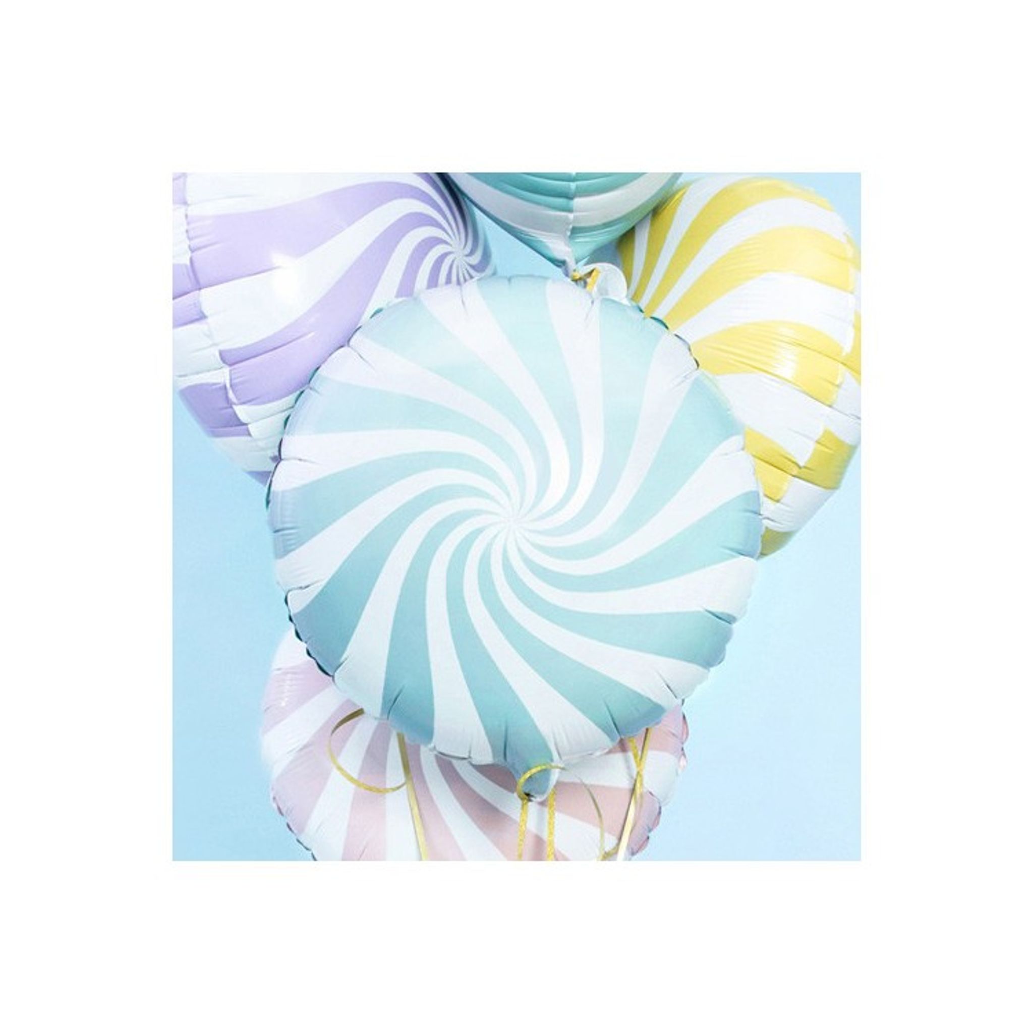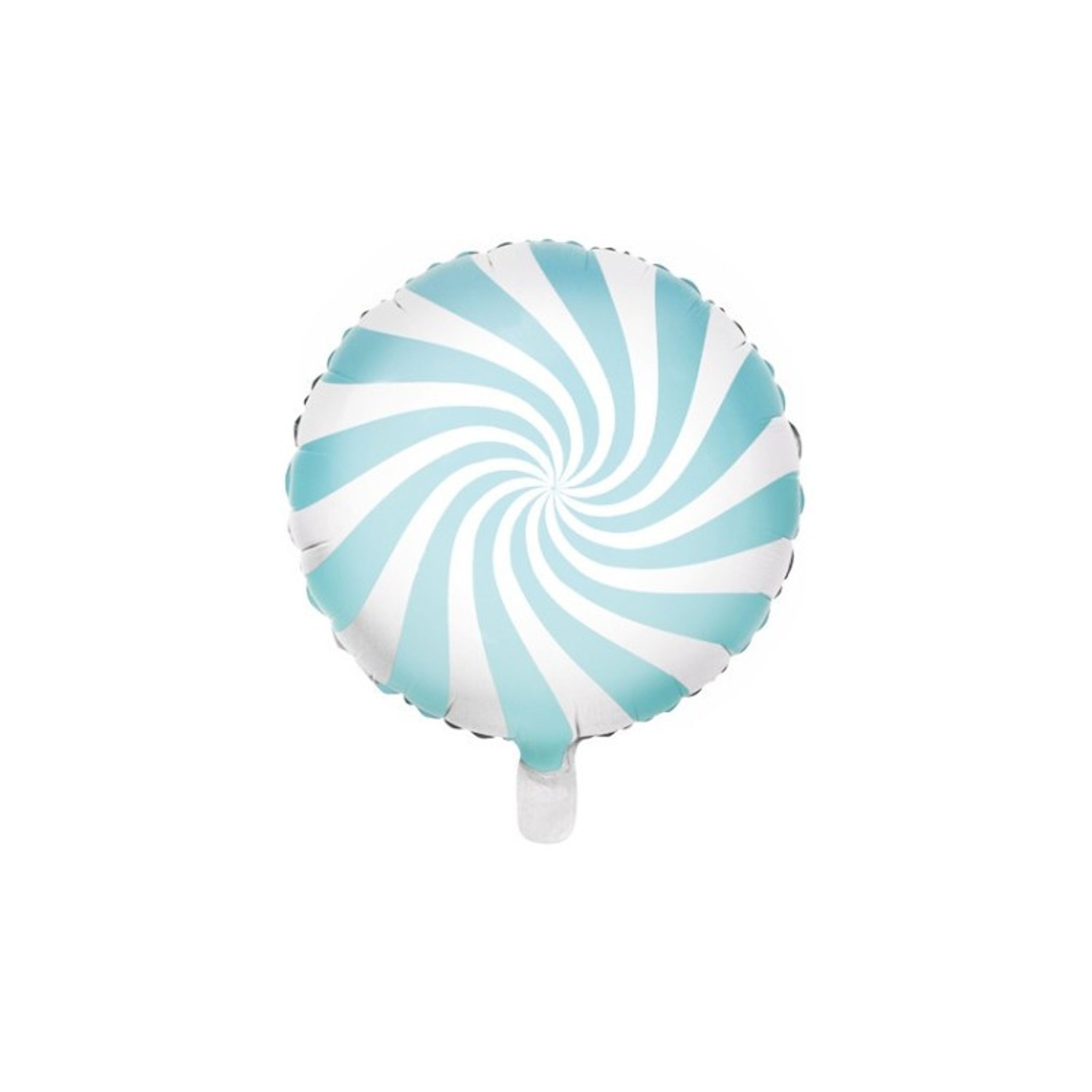 Rund folieballong som ser ut som en ljusblå/vit randig karamell. Ger ett mumsigt intryck på alla festligheter, eller varför inte ge bort som present till den som fyller år? Fyll ballongen med helium om du vill att den ska flyga och annars går det lika bra med vanlig luft (använda då ballongpump eller t.ex ett sugrör för att blåsa upp denna).
