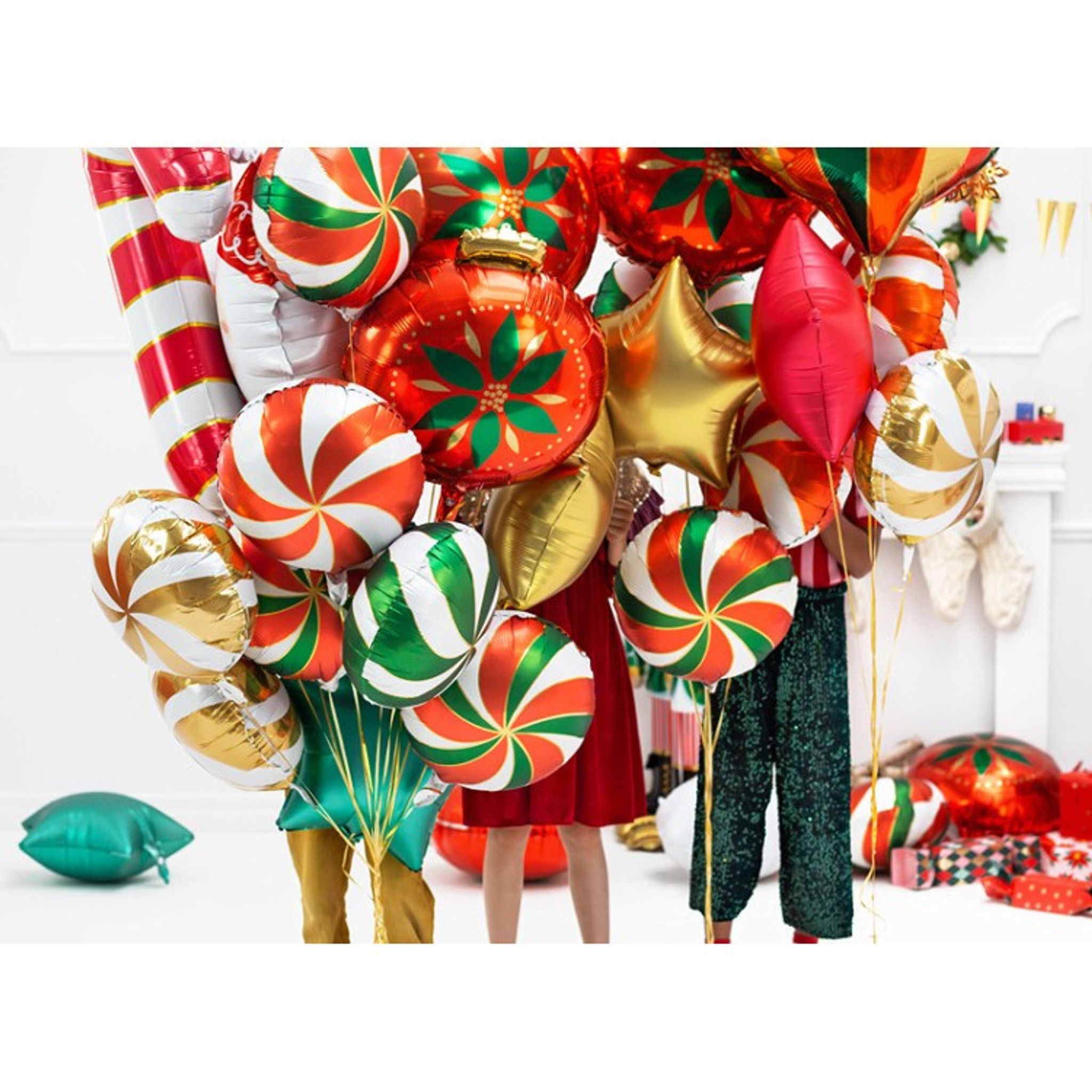 Rund folieballong som ser ut som en röd/vit randig karamell. Ger ett mumsigt intryck på alla festligheter, eller varför inte ge bort som present till den som fyller år? Fyll ballongen med helium om du vill att den ska flyga och annars går det lika bra med vanlig luft (använda då ballongpump eller t.ex ett sugrör för att blåsa upp denna).