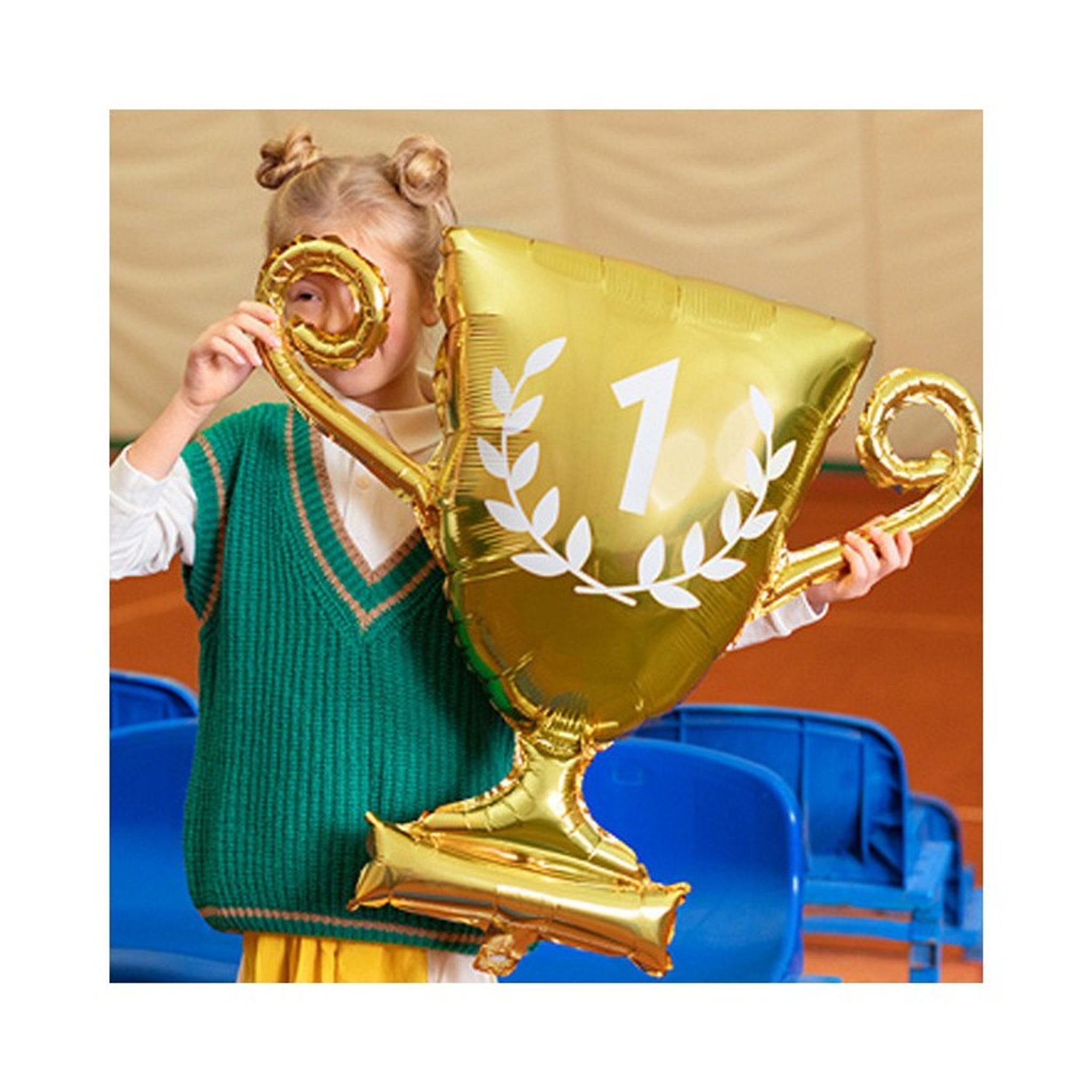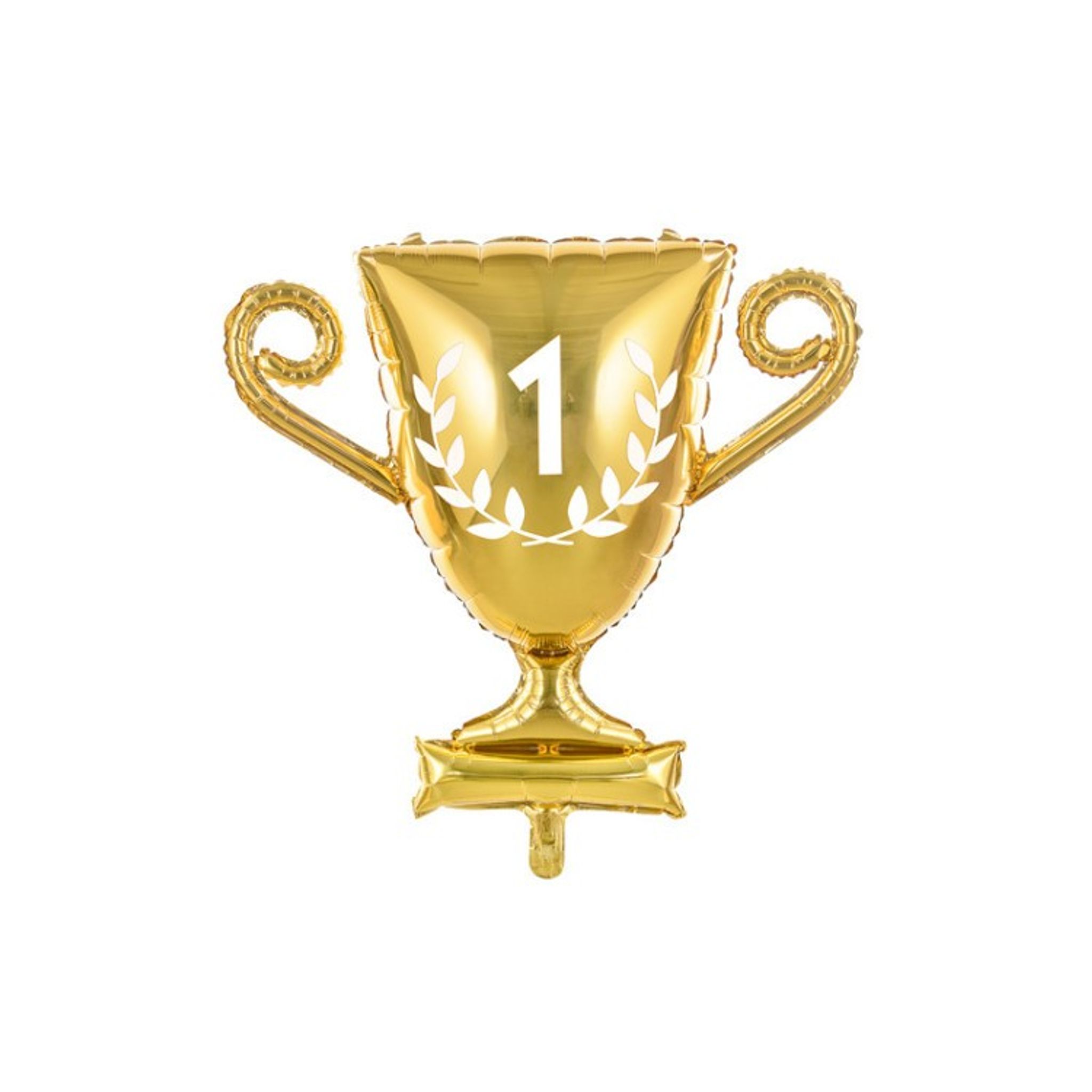 En folieballong är festlig till många tillfällen. Den här ballongen är i form av en pokal med siffran 1 på. Oavsett om du ska fira en vinst med laget eller anordna ett kalas med exempelvis fotbollstema, eller annat sporttema, så är det den perfekta dekorationen. Kan med fördel kombineras med andra ballonger i guld för ett extra maffigt intryck. Häng denna vid kalasets mitt eller ge bort till någon som precis vunnit 1:a pris!