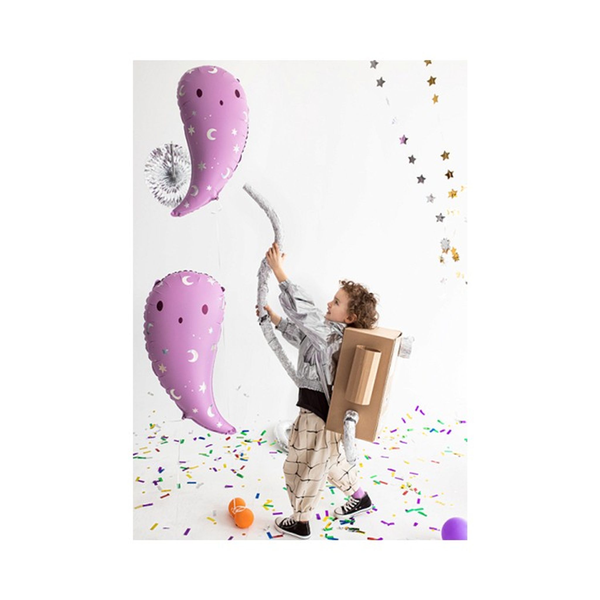Folieballong med formen av ett supergulligt spöke! Spöket är rosa med tryck av små stjärnor och månar i silver.