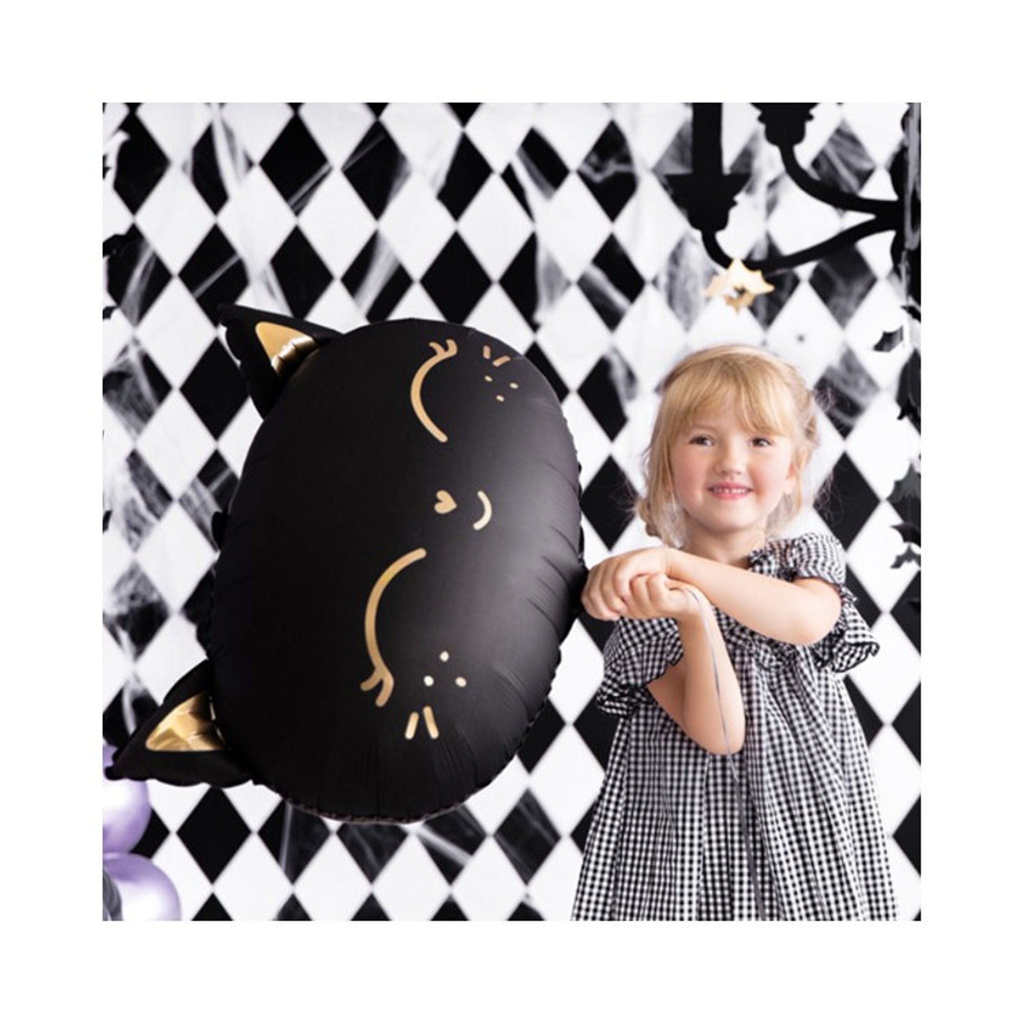 Här är en svart folieballong i form av ett katthuvud. Passar lika bra på kattkalas som på halloweenfesten (då det ör en svart katt) . Katten har även små detaljer i guld.