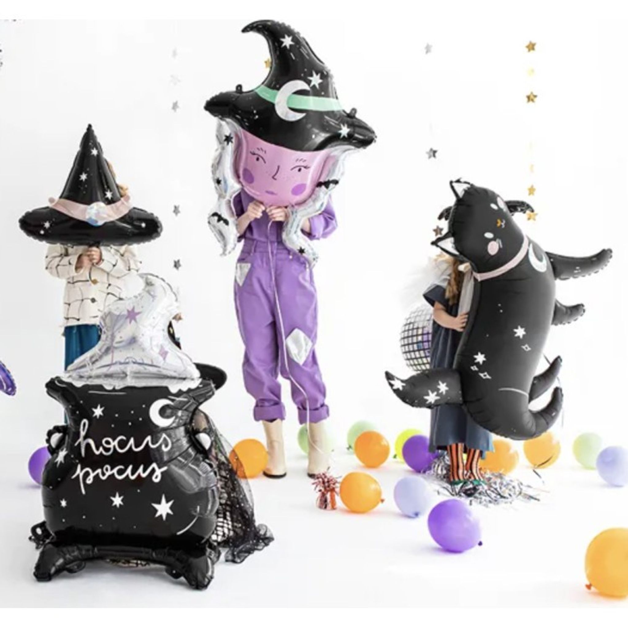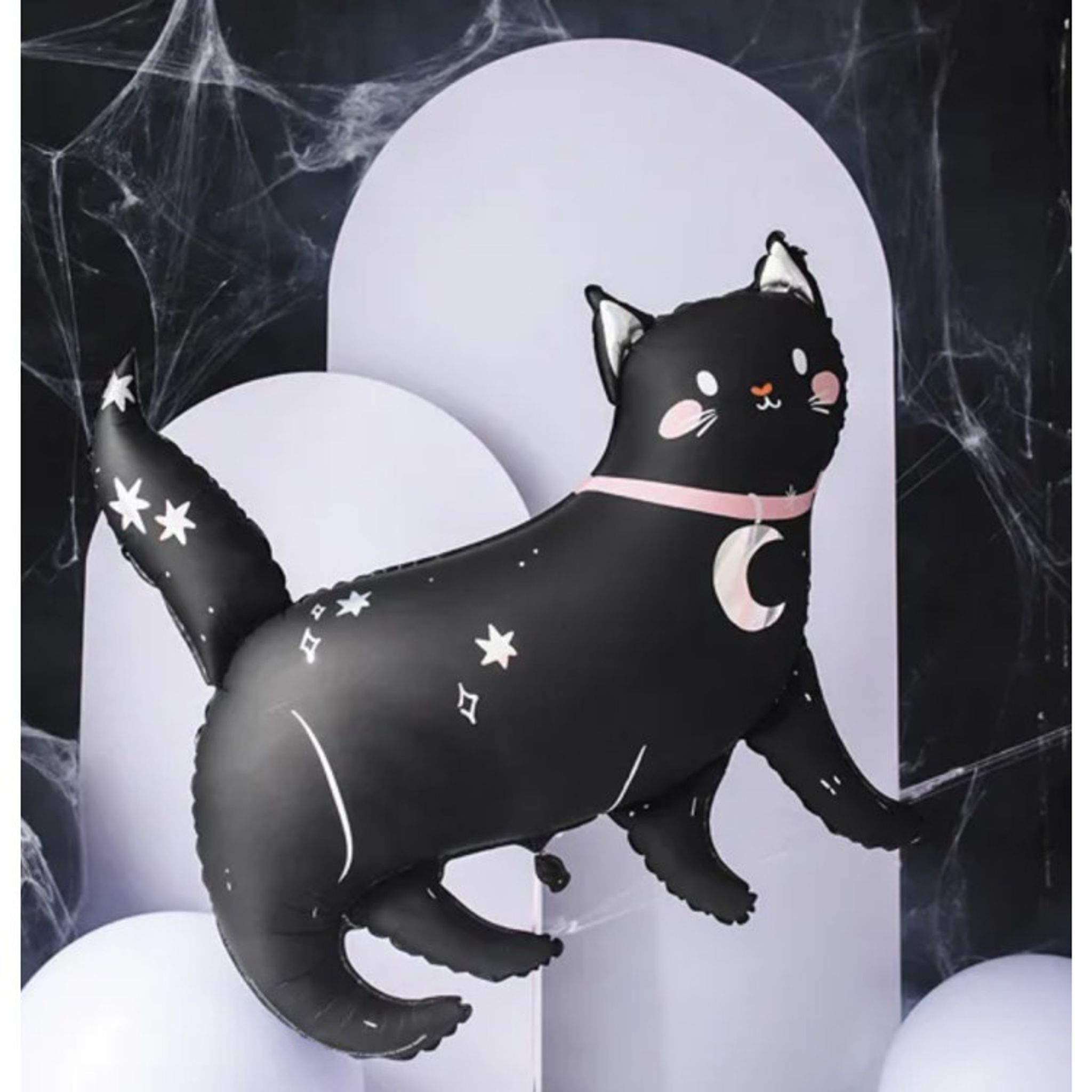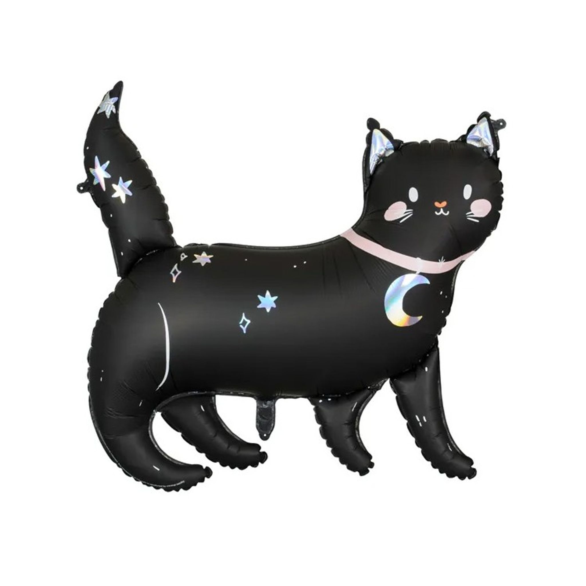 Folieballong svart katt med holografiskt tryck som blir en perfekt dekoration till Halloweenfesten eller som detalj i en större ballongbukett.