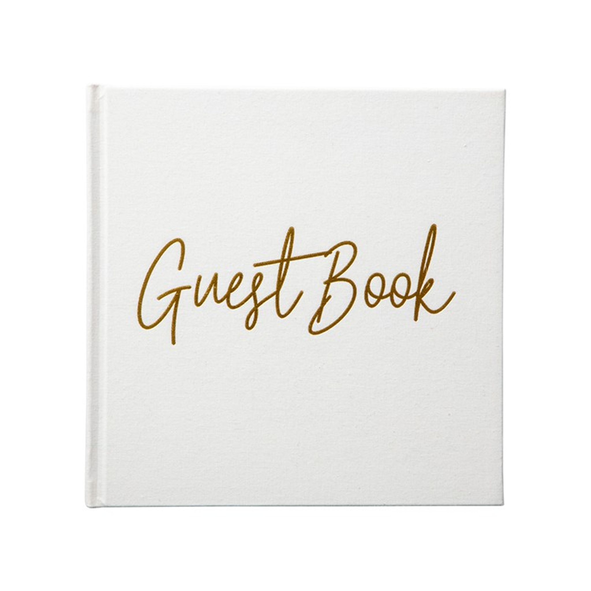 Vacker vit gästbok med blanka sidor. På bokens framsida står det Guest Book med guldfolie som ger den en lyxig känsla.
