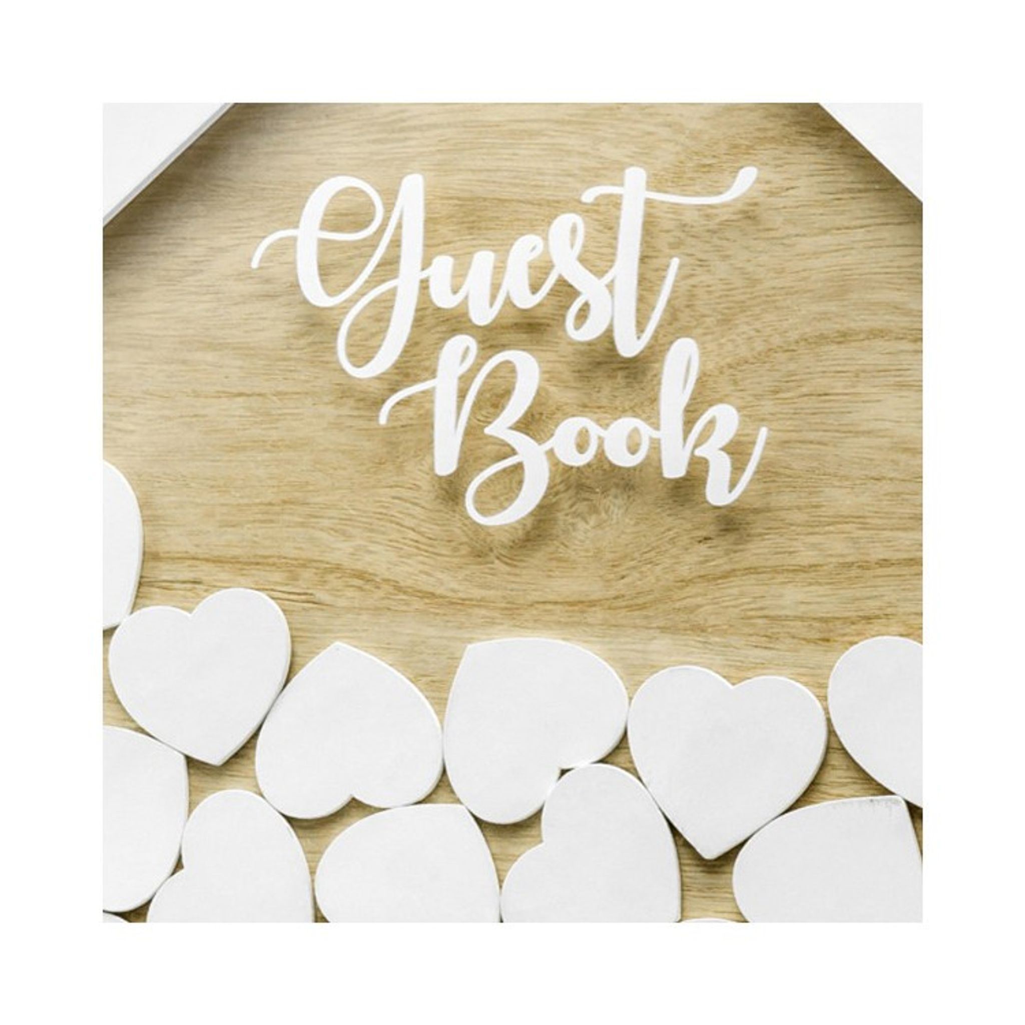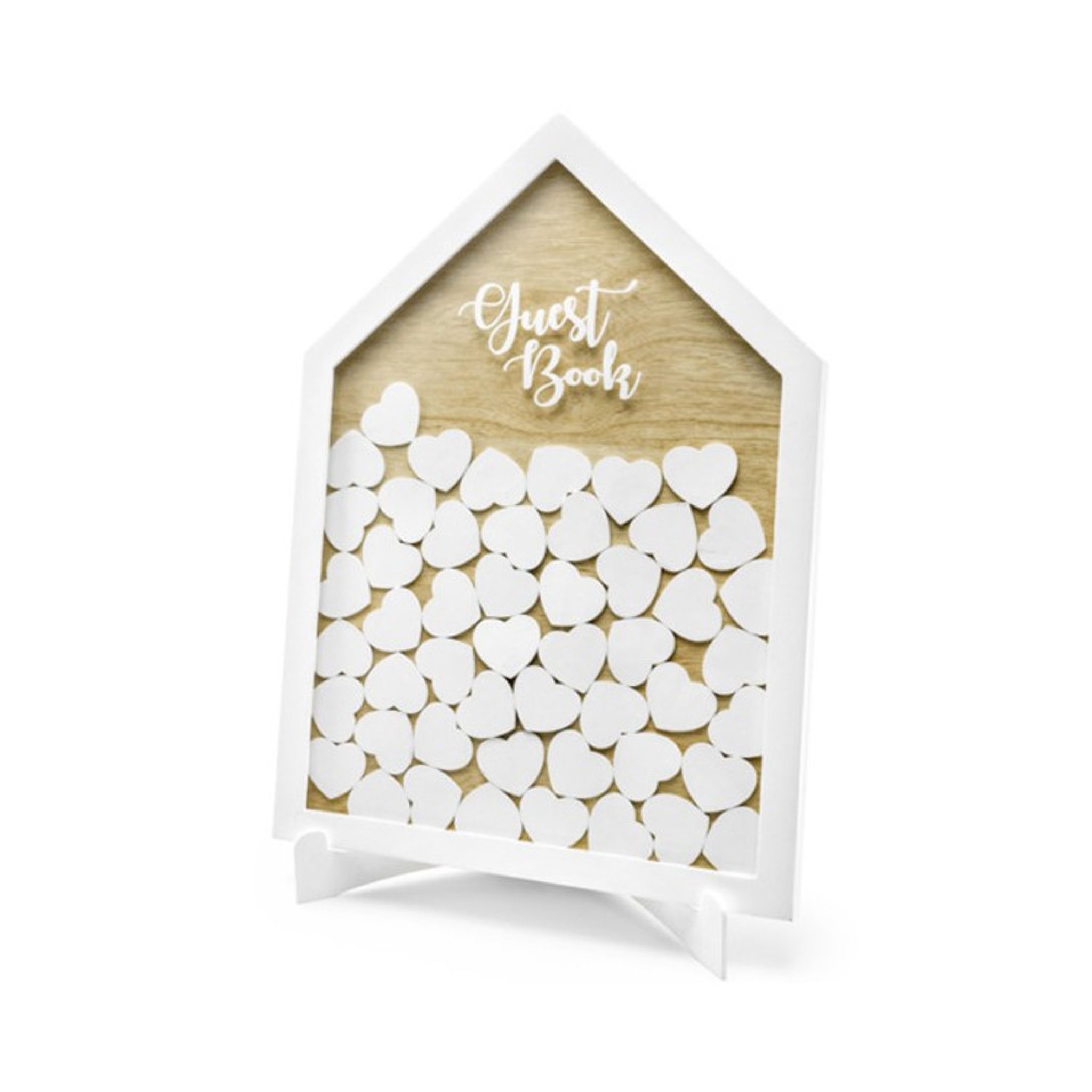 Gästbok i trä med vit inskription, setet innehåller gästbok i form av ett hus och 50 vita hjärtan att skriva på. Perfekt till bröllopet men passar lika bra till bl.a dopet eller 50-årsfesten!