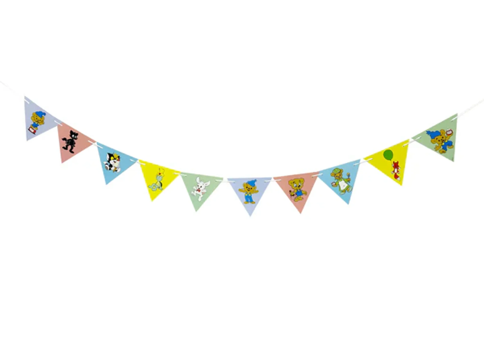 Skapa rätt kalaskänsla med denna färgglada girlang med motiv av Bamse och hans vänner från Rune Andréassons älskade värld. Den två meter långa vimpelgirlangen är perfekt för att dekorera väggar, tak eller kalasbord och bidrar med en lekfull och inbjudande stämning. Med flera olika karaktärer på vimplarna passar den perfekt ihop med övriga Bamse-produkter för ett enhetligt och glatt kalastema. Girlangen är 2 meter lång.