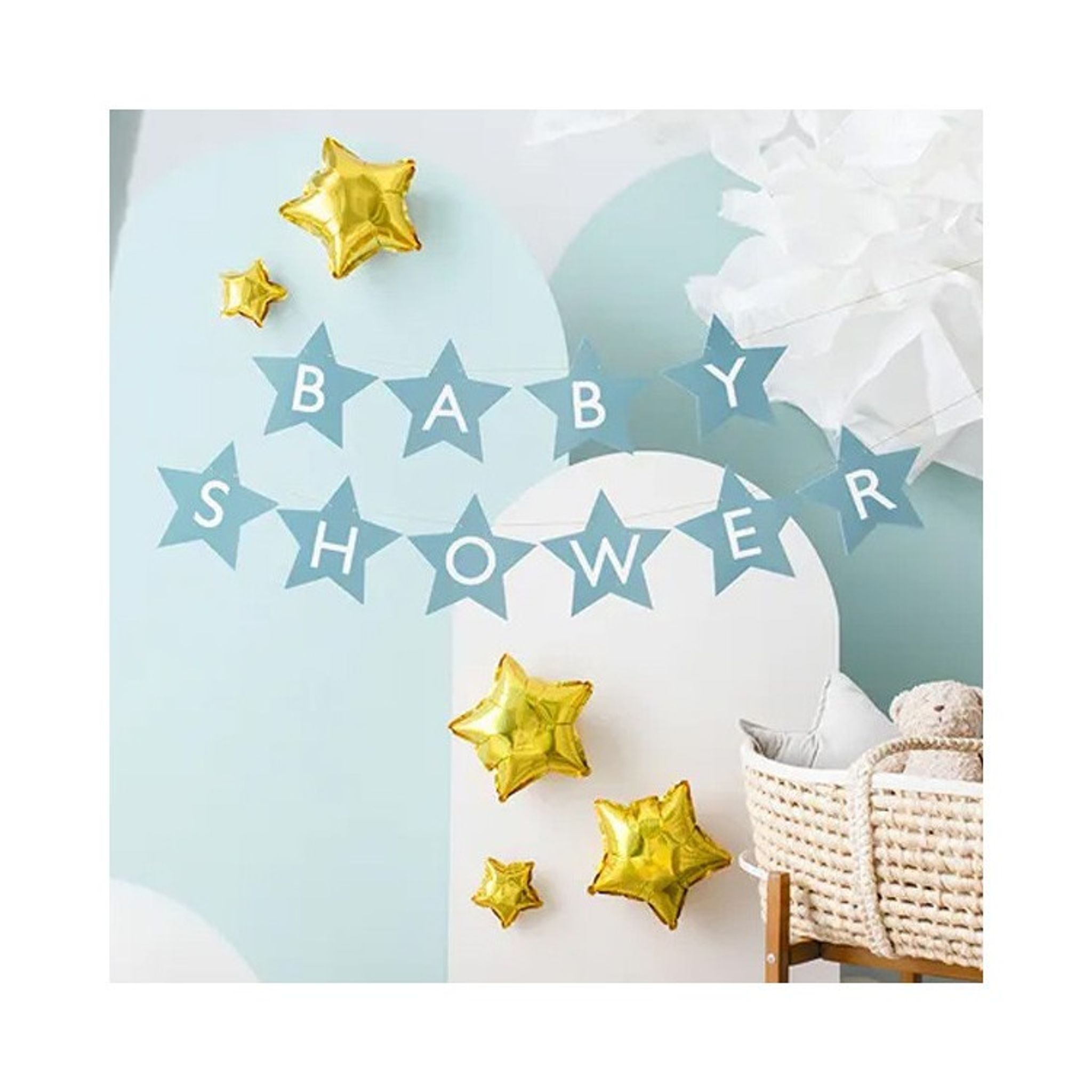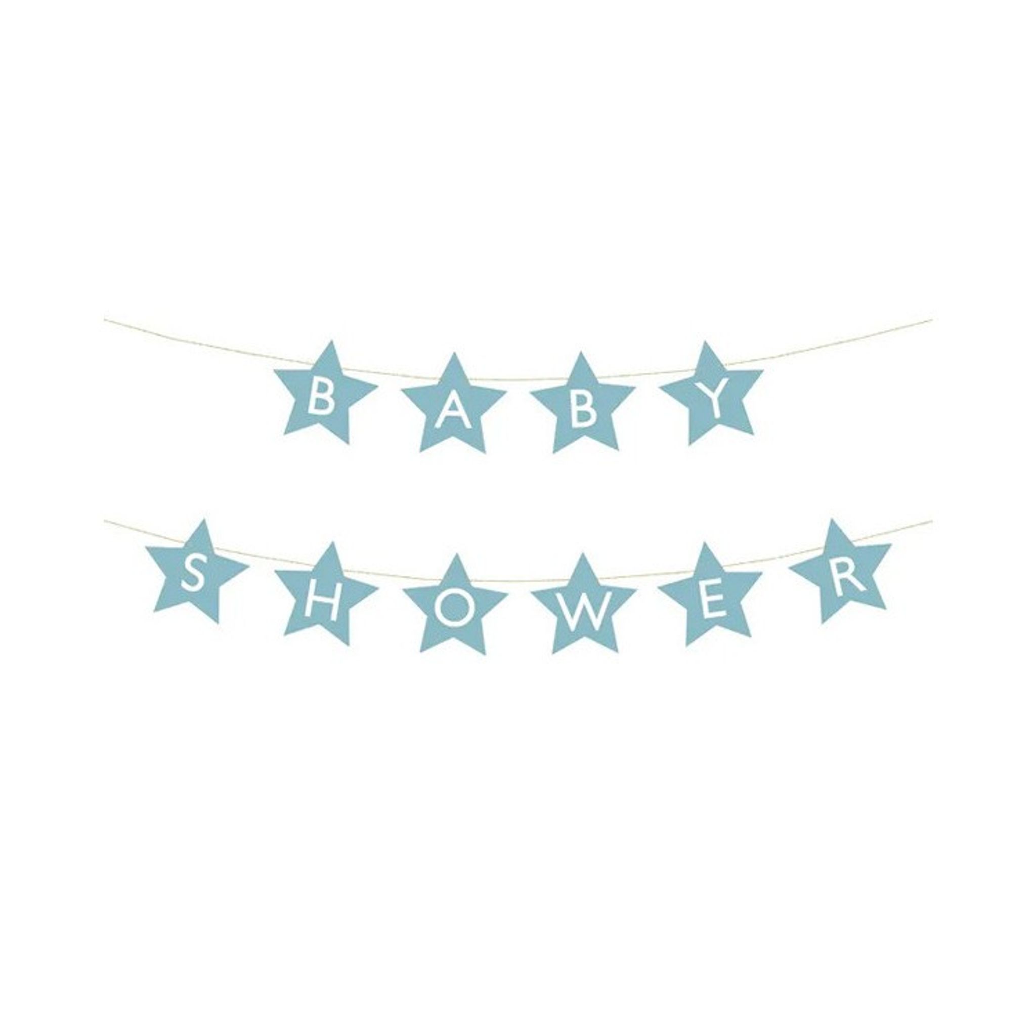 Går din kompis i väntans tider? Överraska med en magisk Babyshower! Den här girlangen med stjärnformade vimplar med bokstäver som tillsammans bilder ordet "Babyshower" är utmärkt för ändamålet. Fin att kombinera tillsammans med andra ljusblåa detaljer.