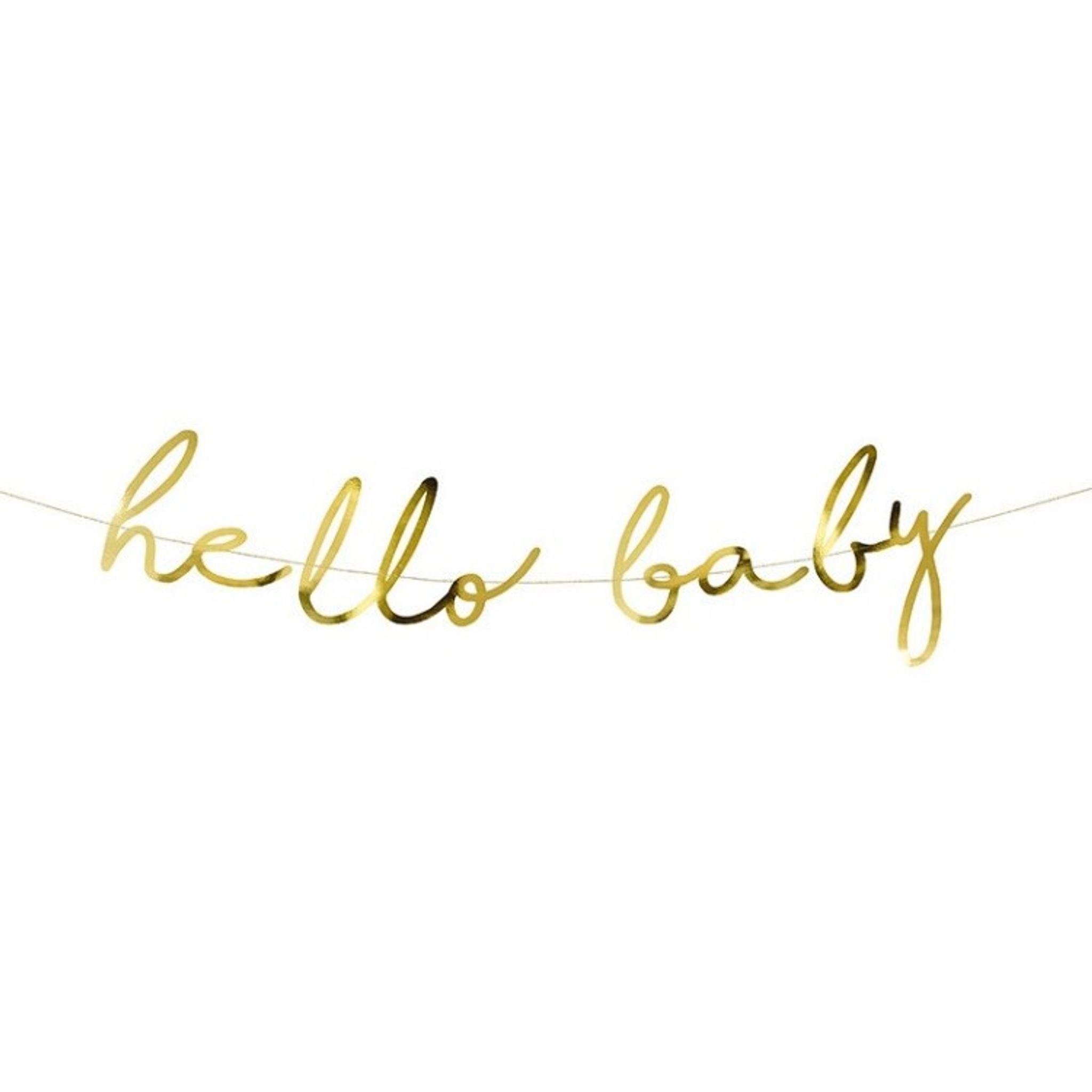 Dekorera med denna pappersgirlang i guld, med texten Hello Baby!