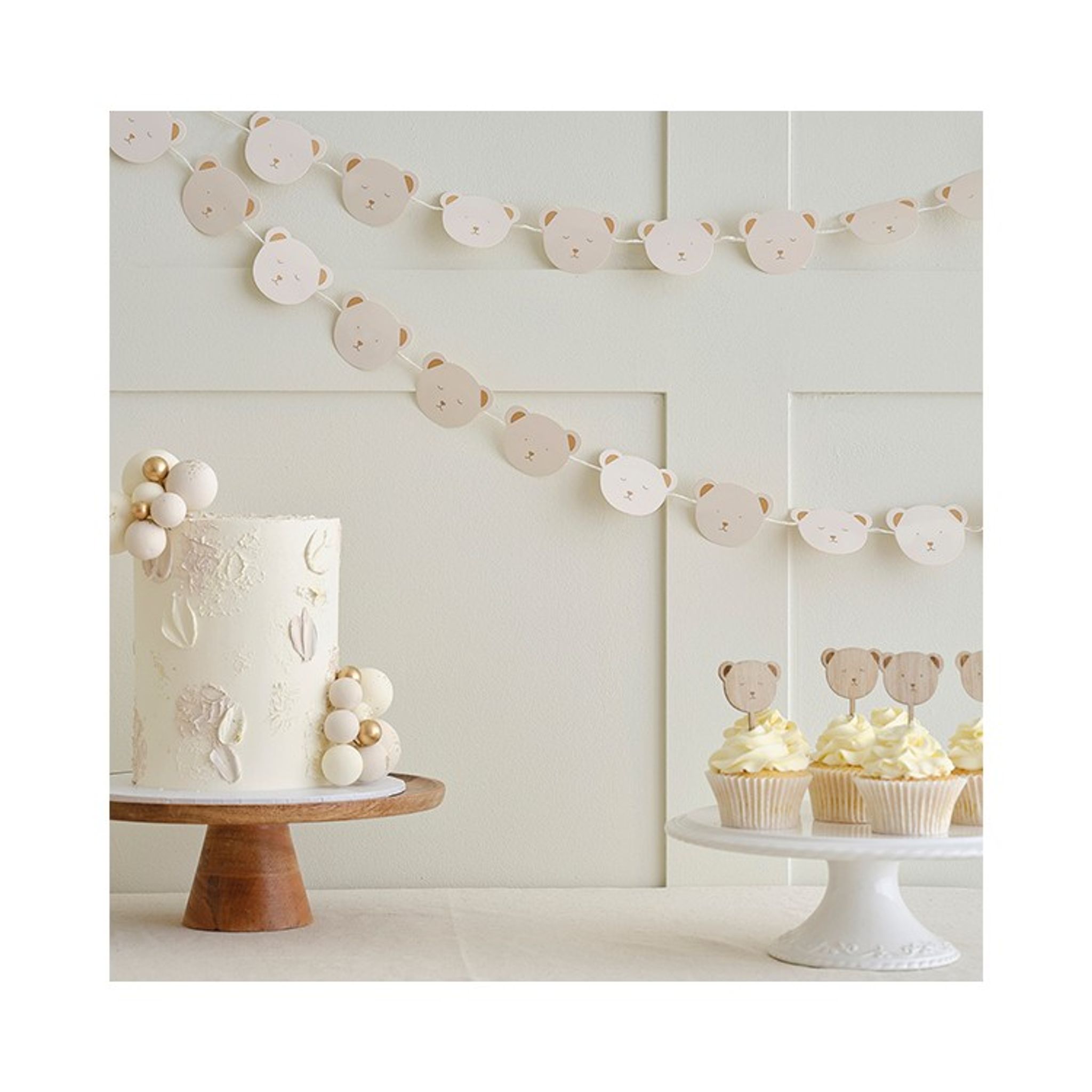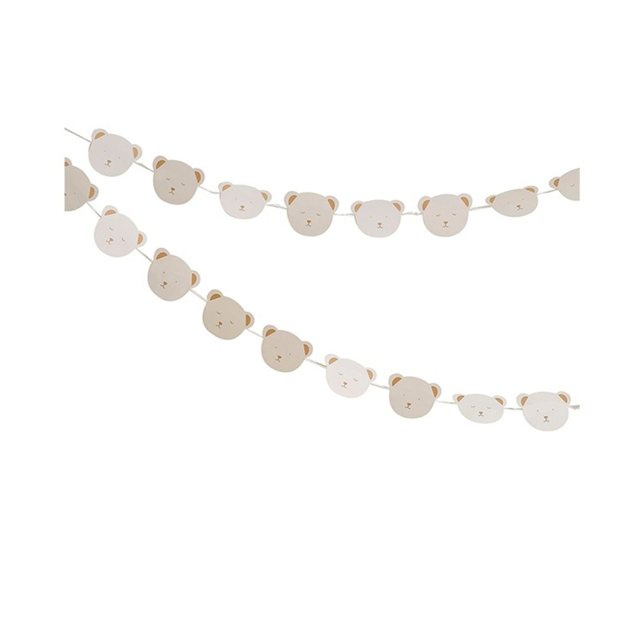 Dekorera med denna söta girlang med Nallar till babyshower, dop eller födelsedag. Nalleansiktena har en vacker karamellton där hälften av nallarna är vakna och tittar och hälften av nallarna är sömniga och blundar.