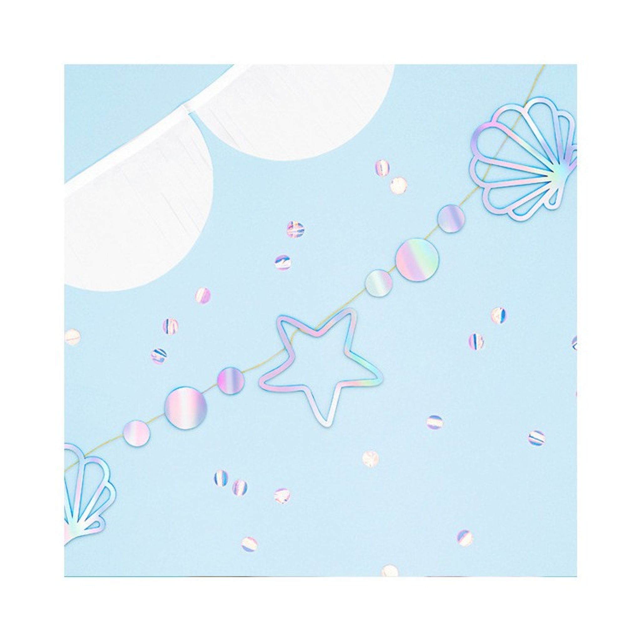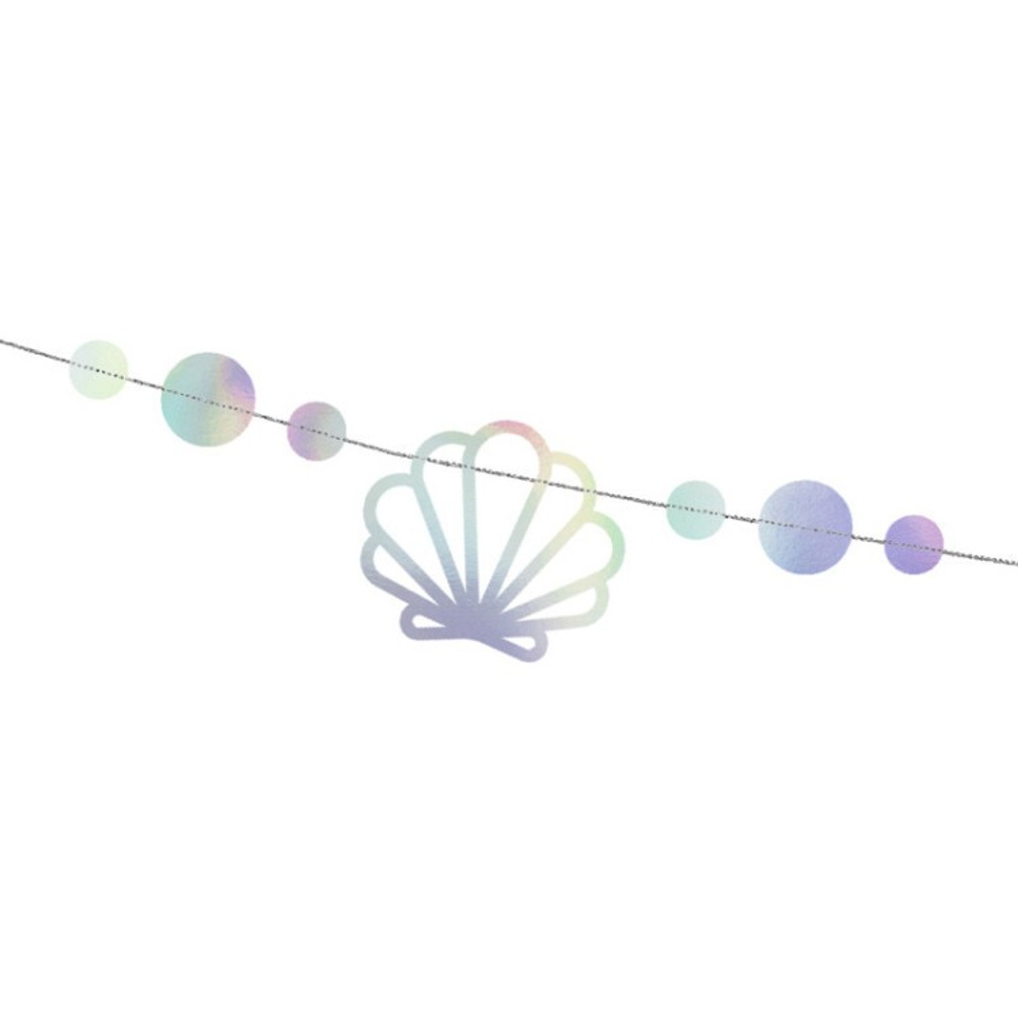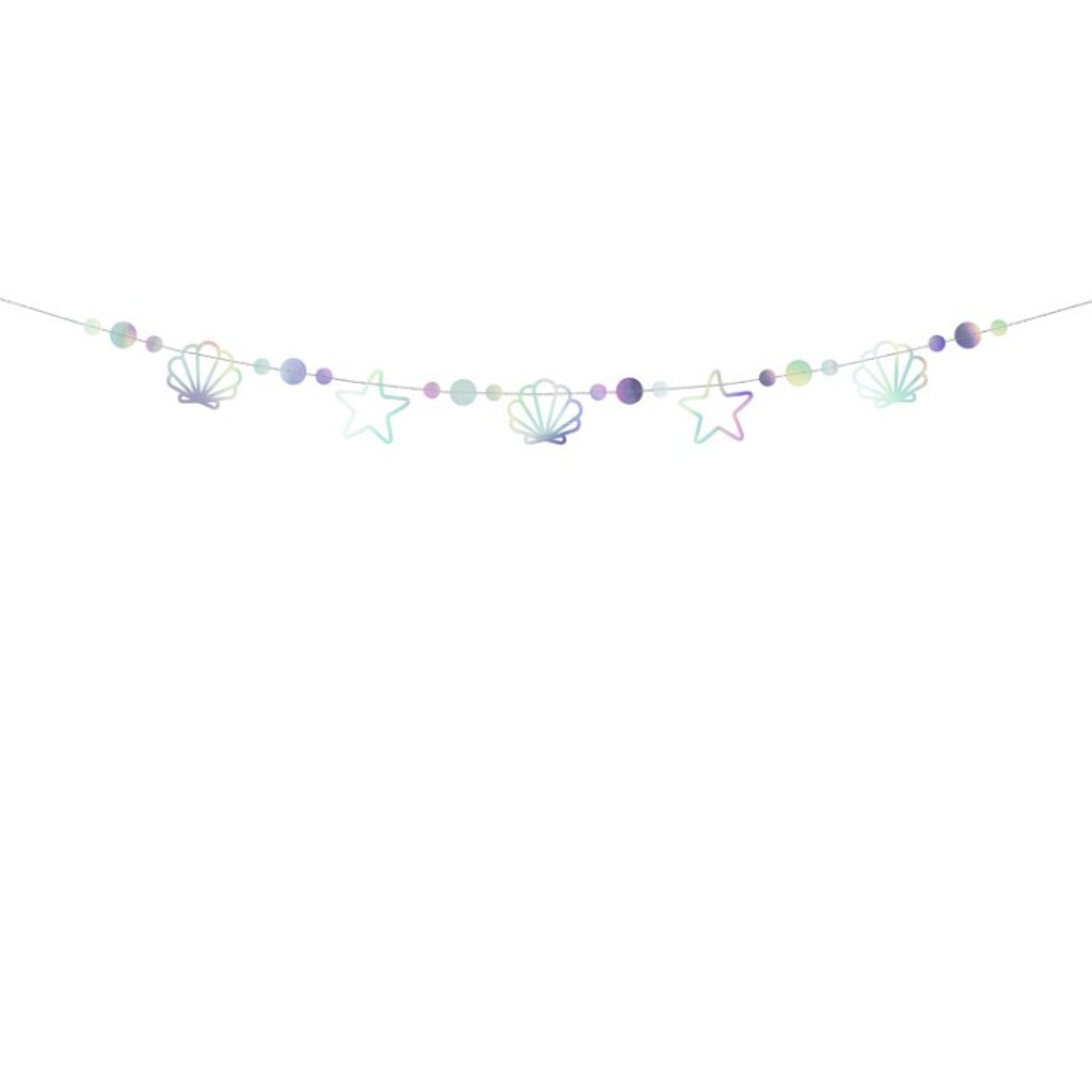 Anordna ett barnkalas med temat Sjöjungfru och dekorera med denna läckra girlang/banner för att skapa en extra festlig känsla. Häng upp över bordet eller längst med en vägg. Girlangen är i silverskimrande papper och består av figurer i form av bla snäckor, pärlor och sjöstjärnor.