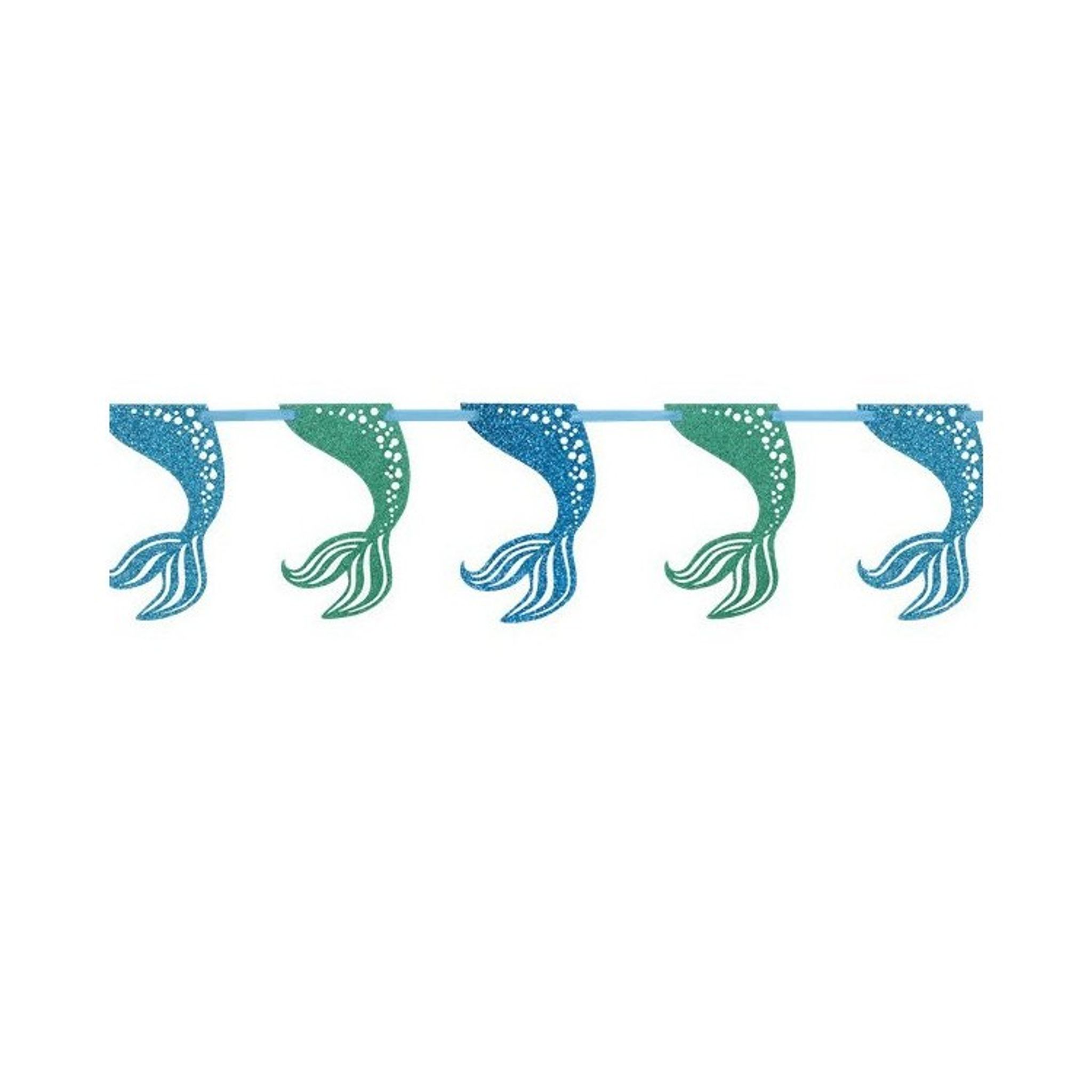 Glittrig girlang med vimplar i form av mermaid tails. Vacker att dekorera med ovanför kalasbordet på barnkalaset med tema sjöjungfru eller havets vänner.