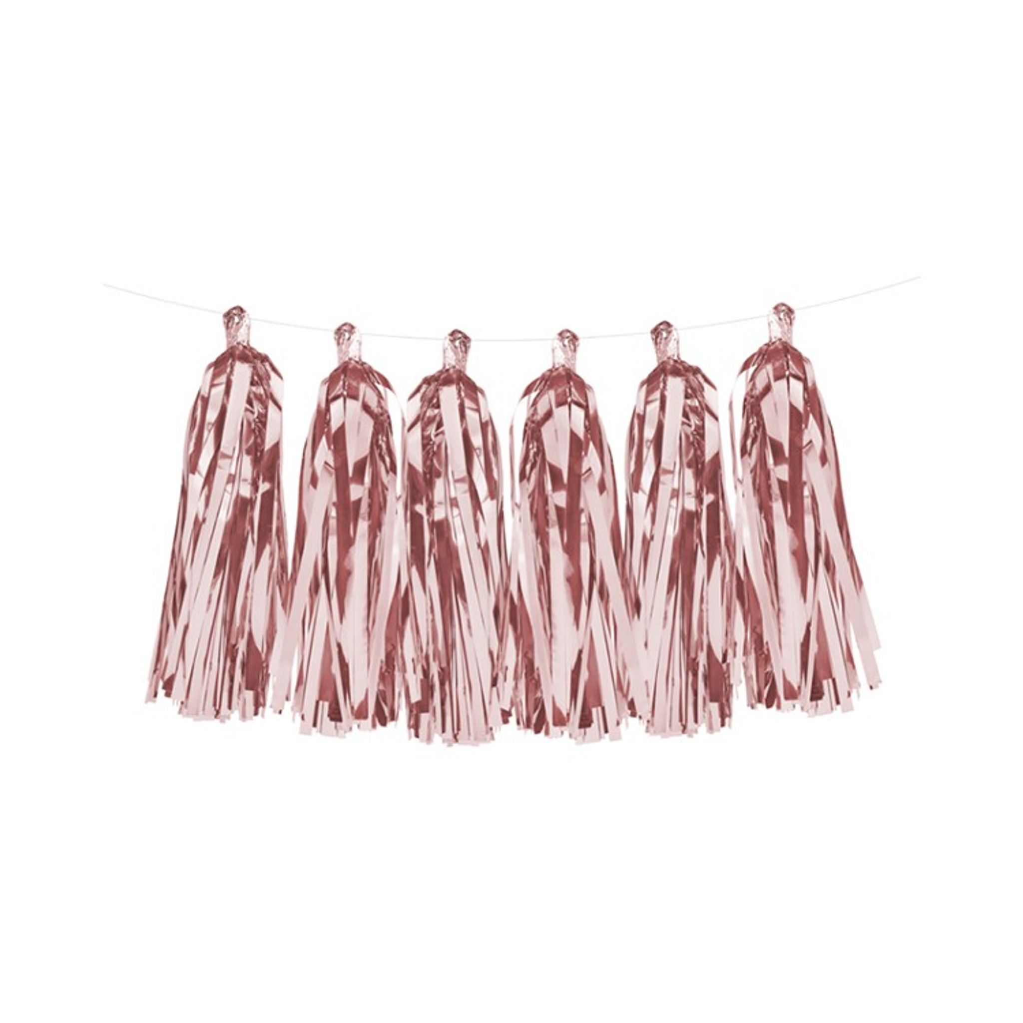 Dekorera lite extra med denna snygga girlang av tassels i roséguld. Lätt att montera ihop till en girlang med det medföljande snöret. Vill man inte ha en girlang är det snyggt att dekorera ballongerna med tassels.