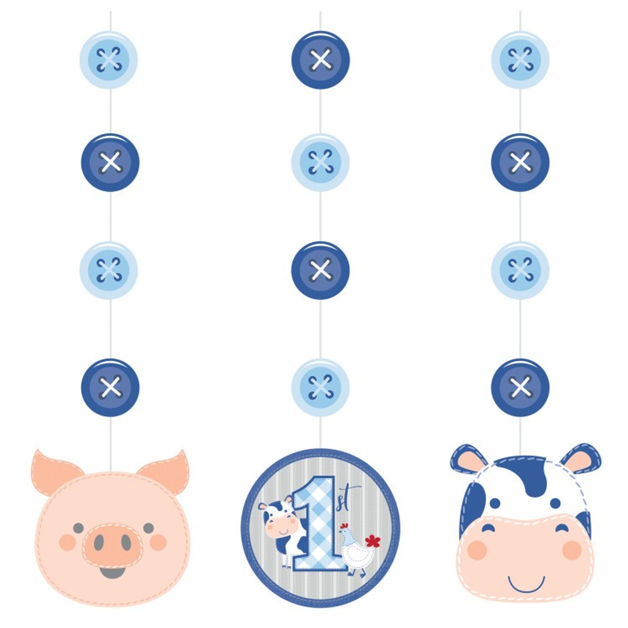 Vill du då även skapa ett bondgårdstema på kalaset så passar dessa girlanger helt perfekt. Själva snöret pryds av pappersmotiv formade som knappar i blåa nyanser. Längst ner på girlangerna finns sedan pappersdekorationer i form av en gris, en ko och en bild där en rutig 1:a ingår. Perfekt att t.ex hänga över kalasbordet!