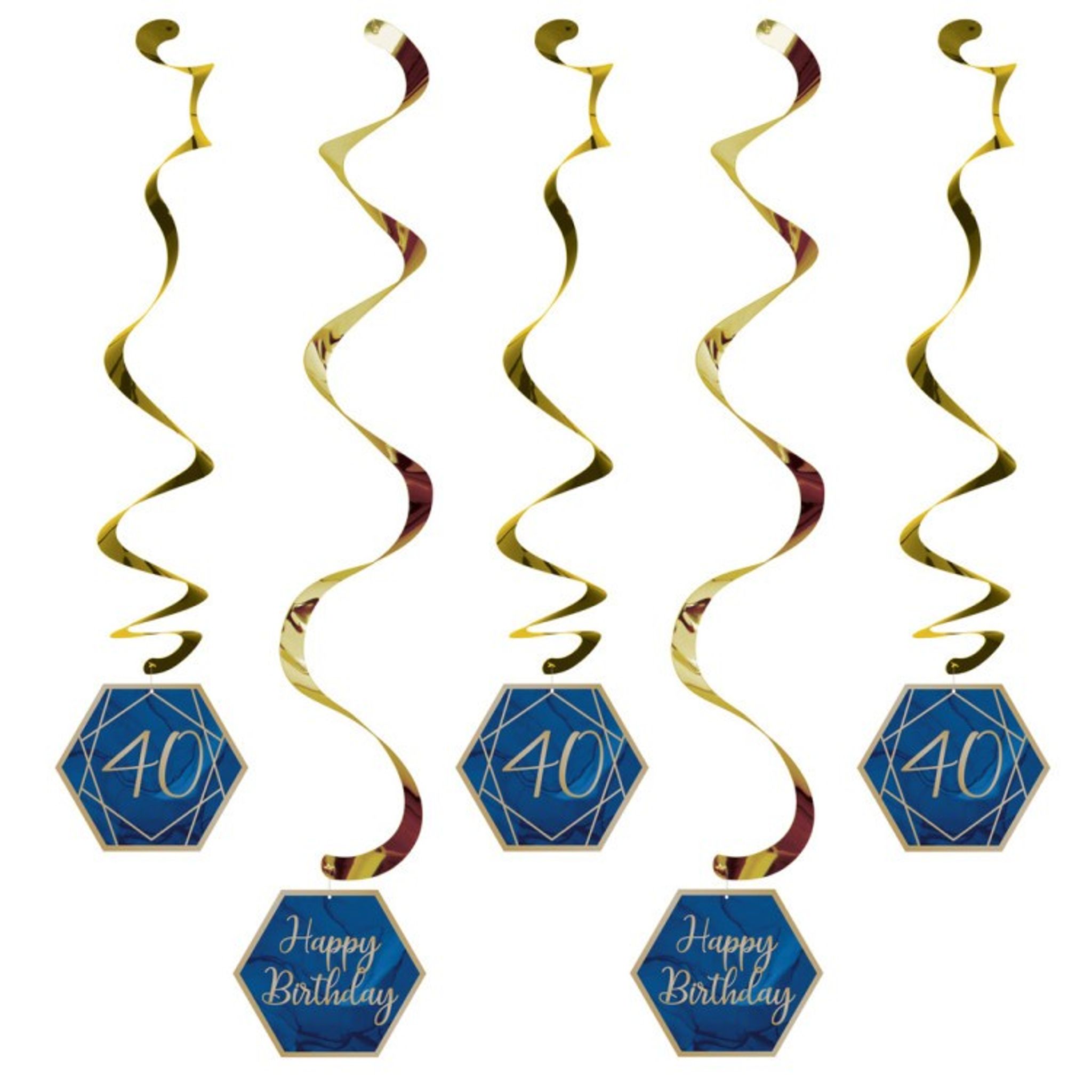 Förpackningen innehåller 5 st girlanger med motiv av siffran 40 och texten Happy Birthday.