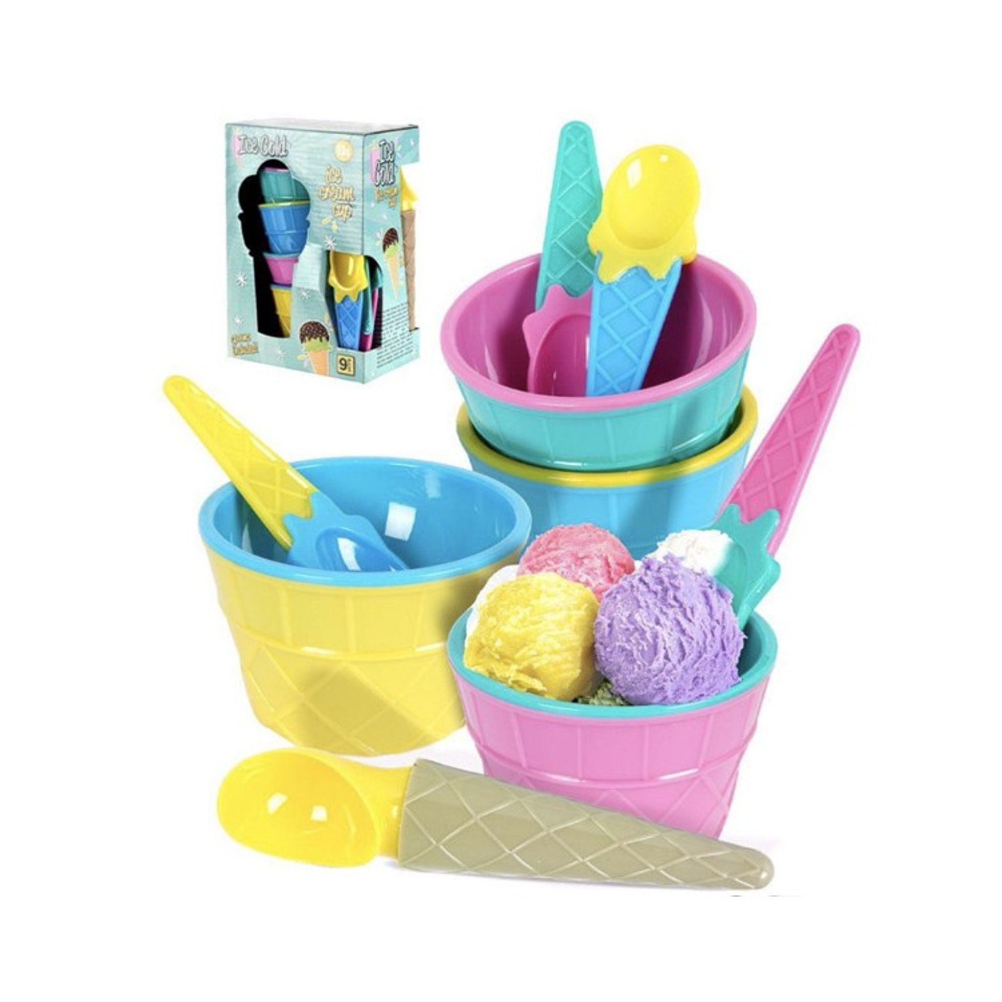 Förpackningen innehåller: 4st glassbägare, 4st skedar och 1st glasskopa. (Totalt 9 delar).
