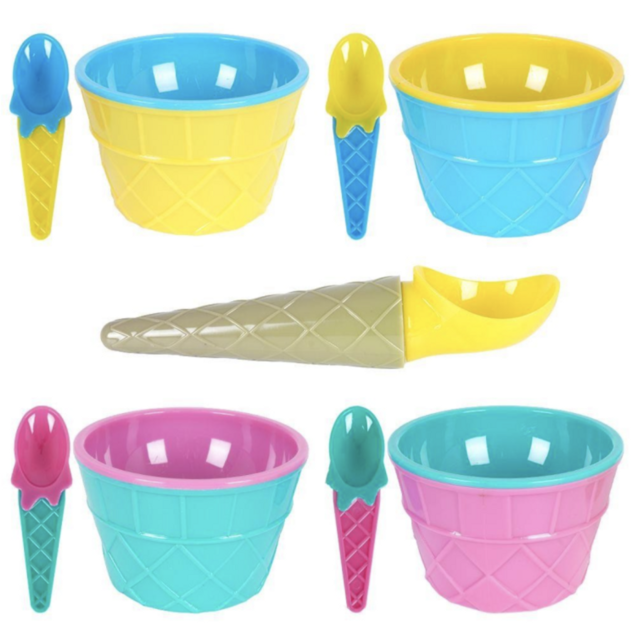 Glass set med glassbägare, skedar, och en glasskopa allt format som en glass i härligt glada färger. Kul inslag till både kalas och fest men också till barnens glass en varm sommardag.