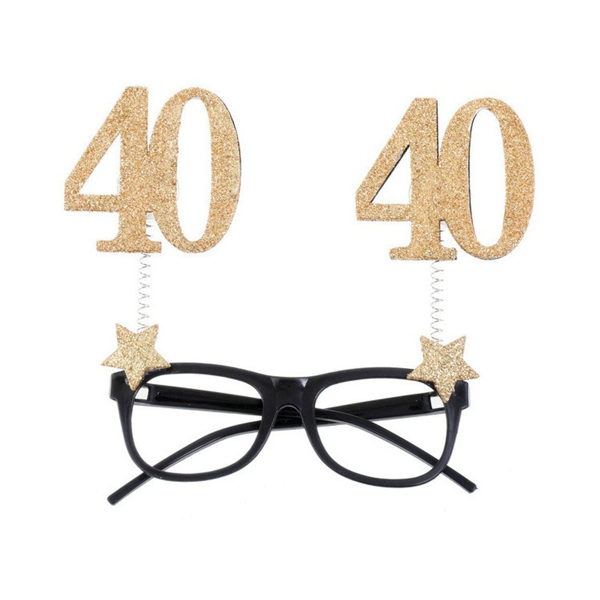 Dressa upp i dessa coola glasögon med siffran 40 på ditt 40 årskalas och du kommer garanterat få igång feststämningen. Glasögonen är svarta med glittriga guldsiffror som pryder glasögonen tillsammans med stjärnor i guld.