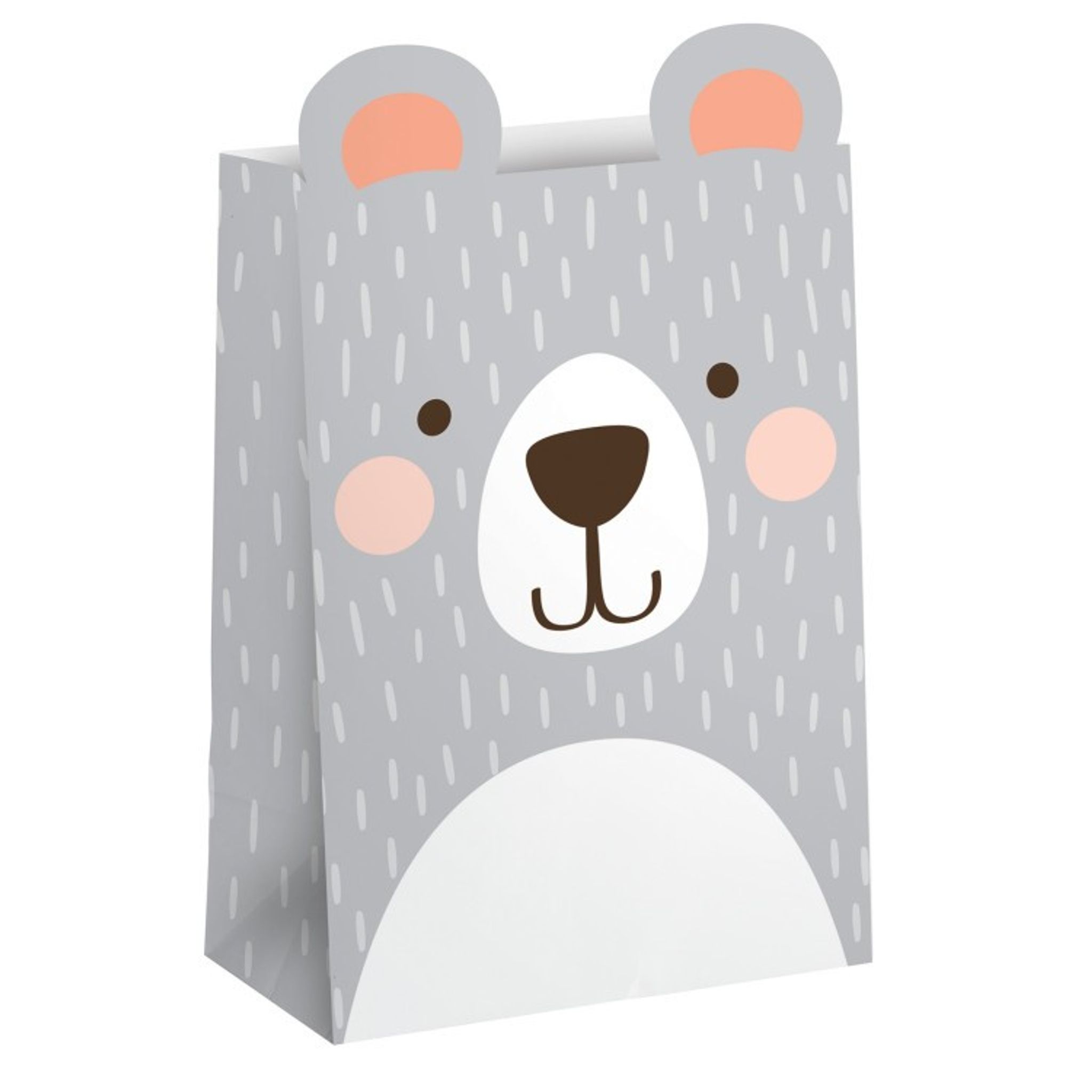Behöver du riktigt söta godispåsar till barnkalaset? Dessa otroligt söta påsar med motiv av en nalle är då den perfekta lösningen. Påsarna är i en snygg ljusgrå nyans. Fyll med godsaker eller roliga små leksaker och dela ut till deltagarna på kalaset. För de mindre deltagarna kan man fylla påsen med t.ex majskrokar.
