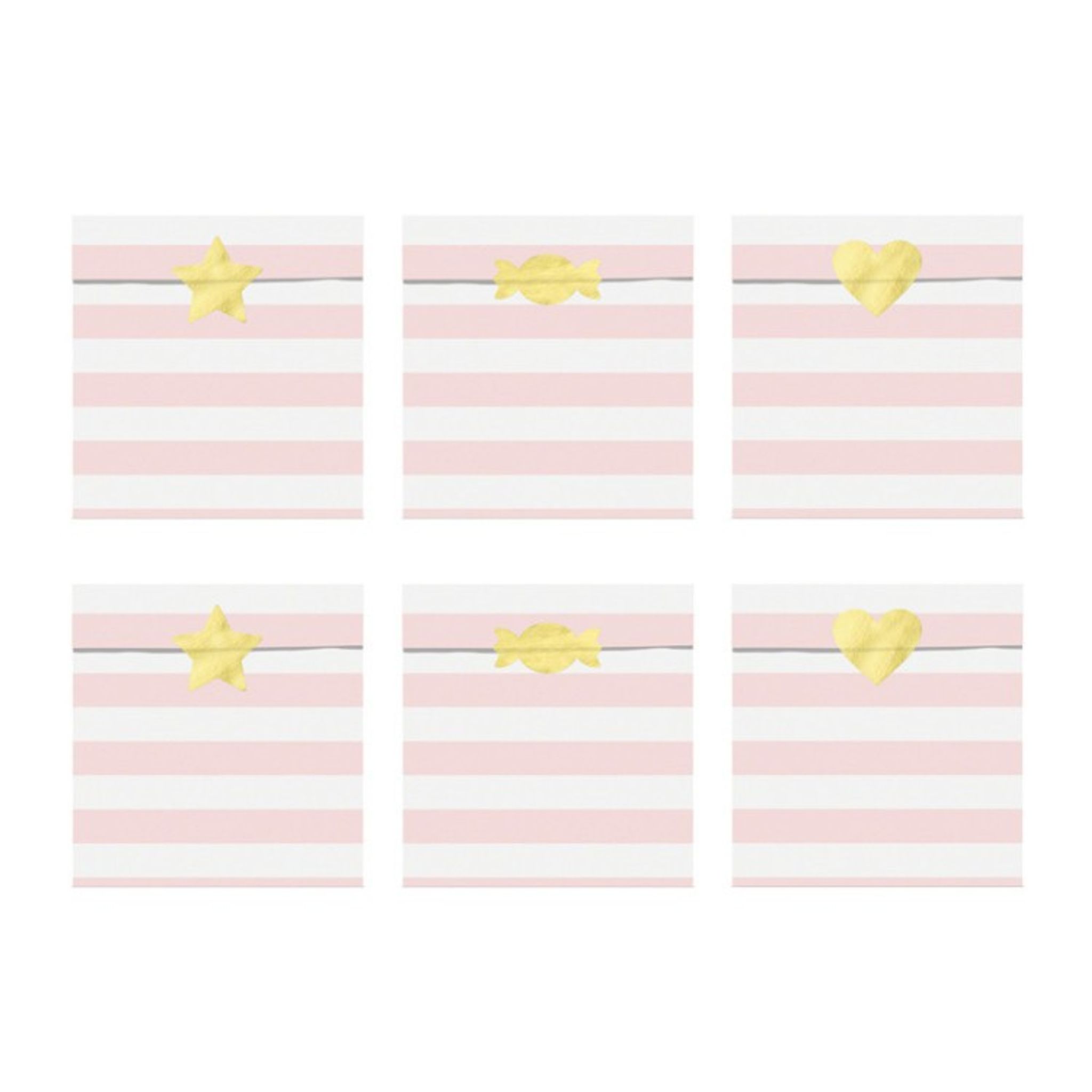 Söta rosa/vit randiga godispåsar med guldiga klistermärken.