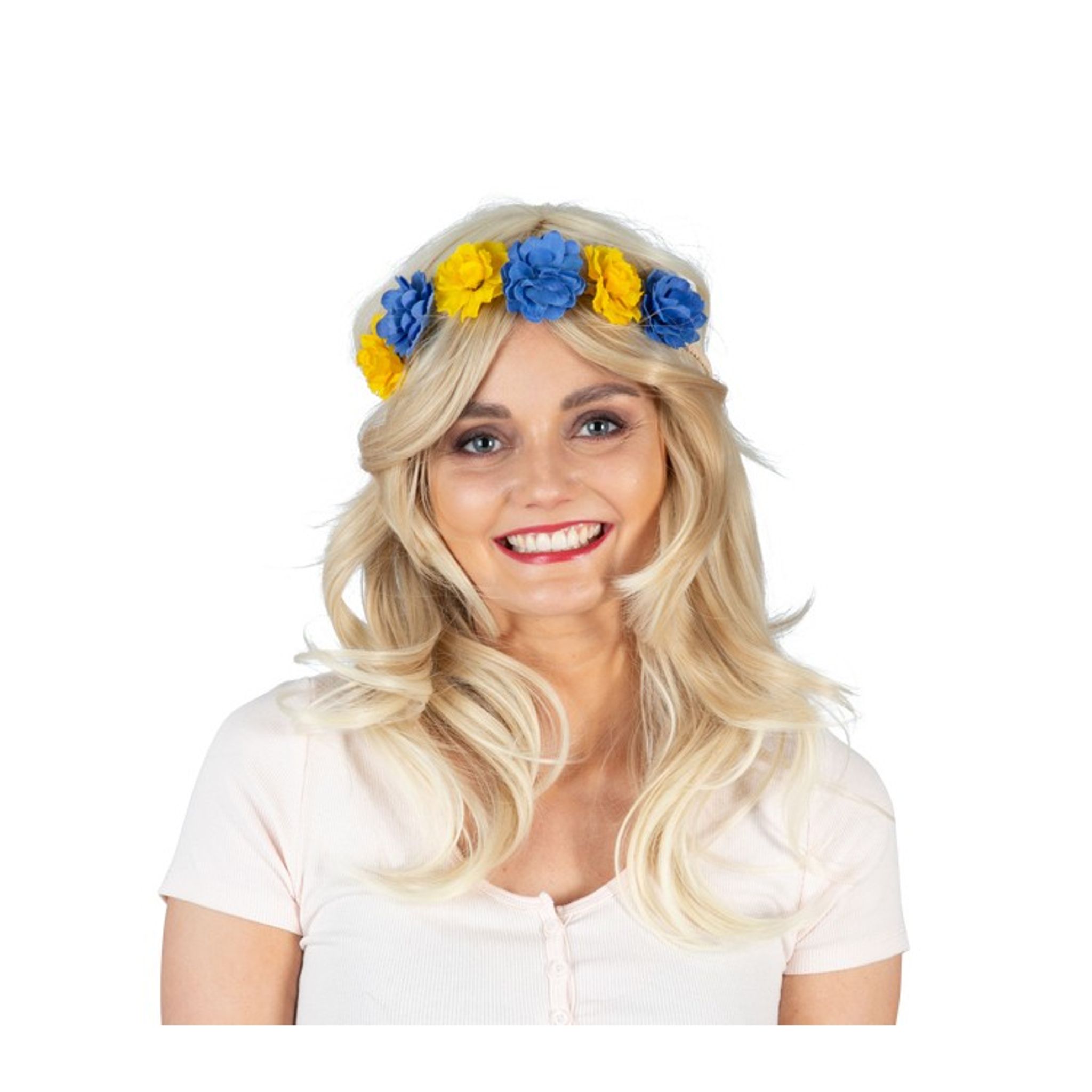 Elastiskt hårband med blå och gula blommor framtill. Perfekt till sommarfesten, skolavslutningen, nationaldagen, studenten eller som supporter på en match eller tävling.