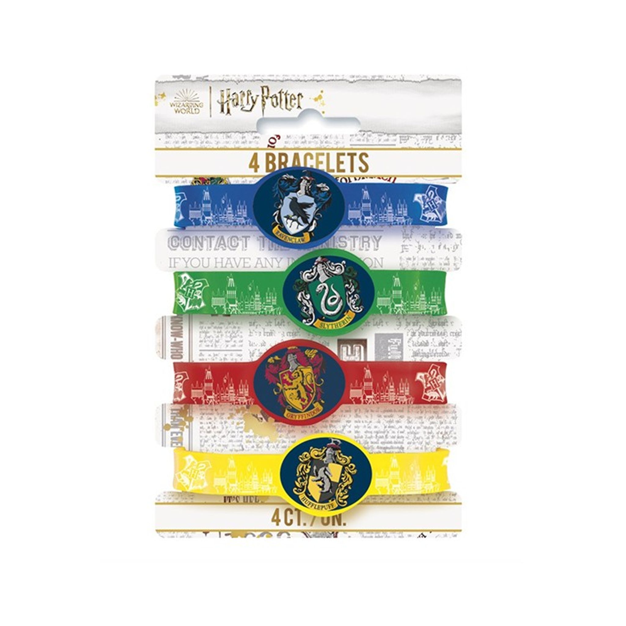 4 stycken armband i blått, grönt, rött och gult med motiv av Gryffindor, Slytherin, Ravenclaw och Hufflepuff emblem. En fin present till Harry Potter älskaren eller varför inte lägga i kalaspåsen till kalaset.