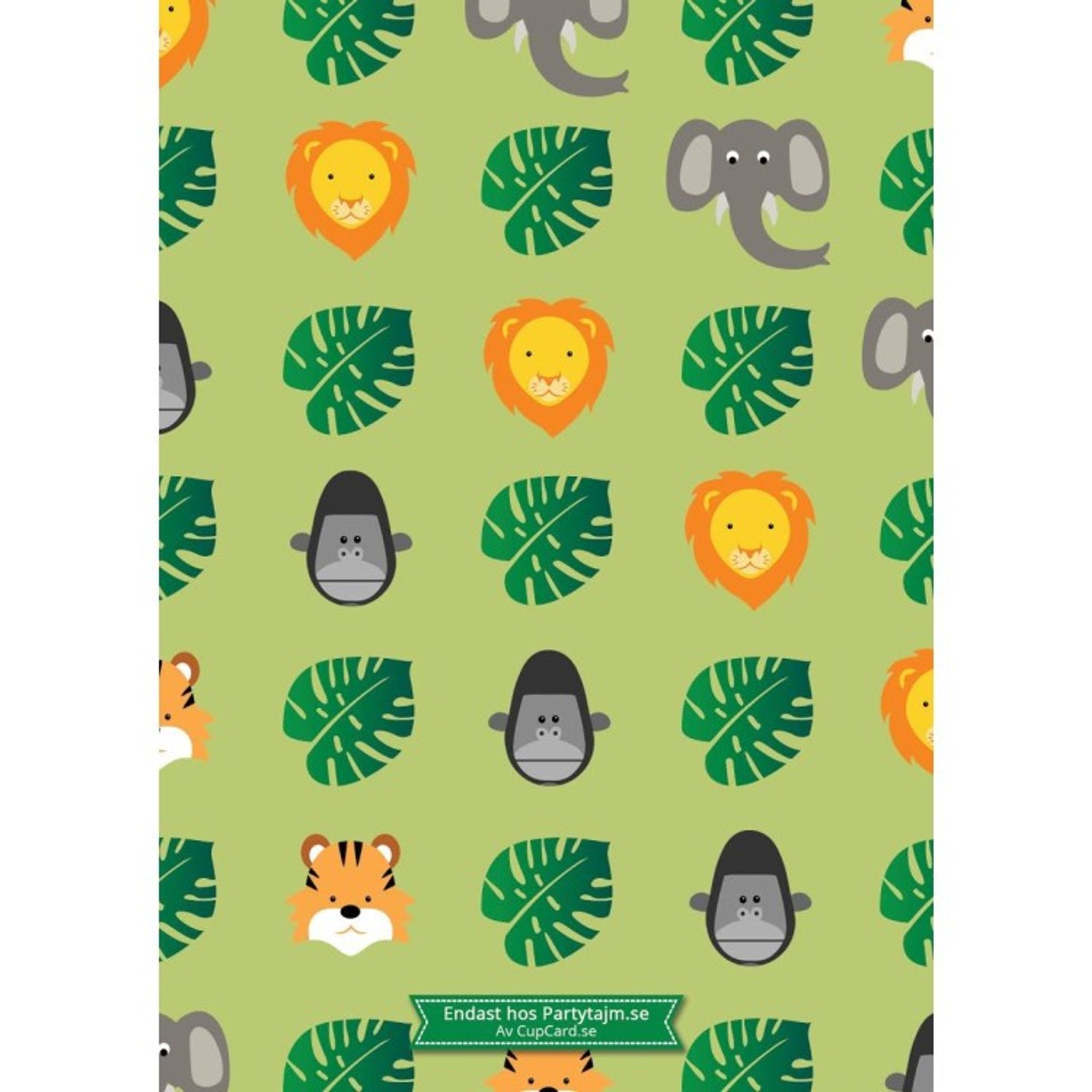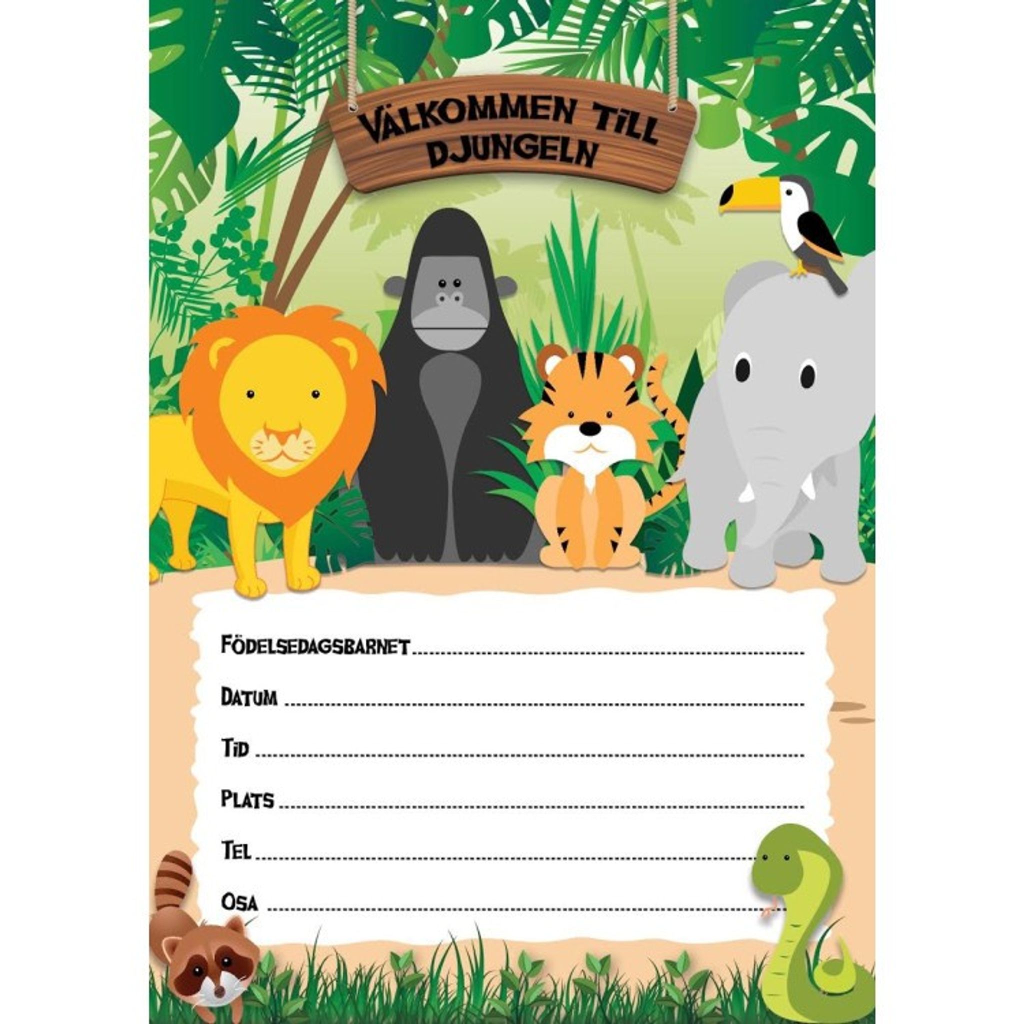 6 st fantastiskt fina inbjudningskort i härlig färger med gulligt Djungel-motiv som passar perfekt när du skall bjuda in ditt barns vänner till ett skojigt Djungel-kalas. Baksidan är lika fin som framsidan med massor av fina detaljer! Kuvert ingår. Partytajms egna design, svensk text.