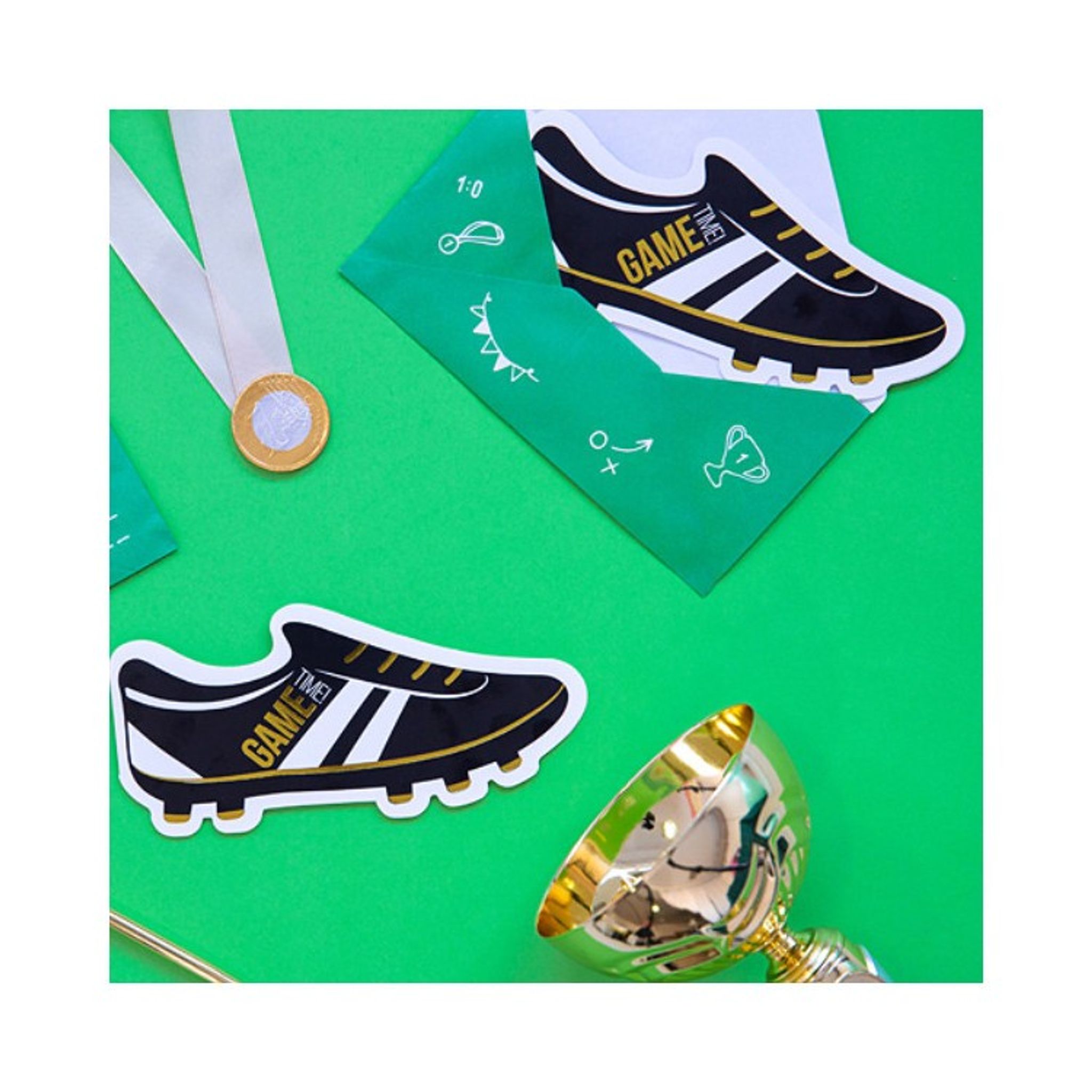 Förpackningen innehåller 6 stycken inbjudningskort i form av en fotbollsko i vit färg med svart och metalliskt guldtryck (storlek ca 19 x 9 cm) och 6 stycken kuvert i en snygg grön färg.