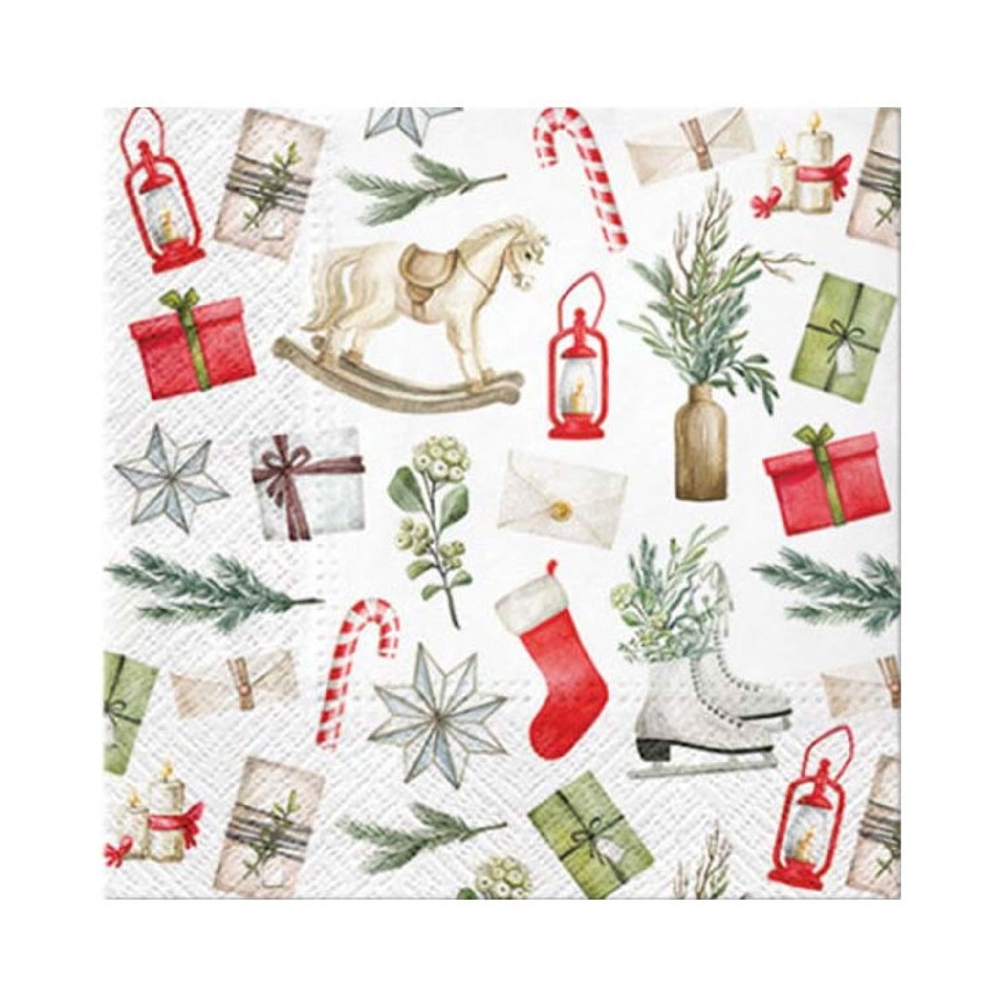 Kanske årets snyggaste julservetter. Servetterna har vit bakgrund med motiv av olika juliga tillbehör såsom paket, polkagriskäppar och kvistar. En mycket fin detalj när du ska duka upp årets julbord.