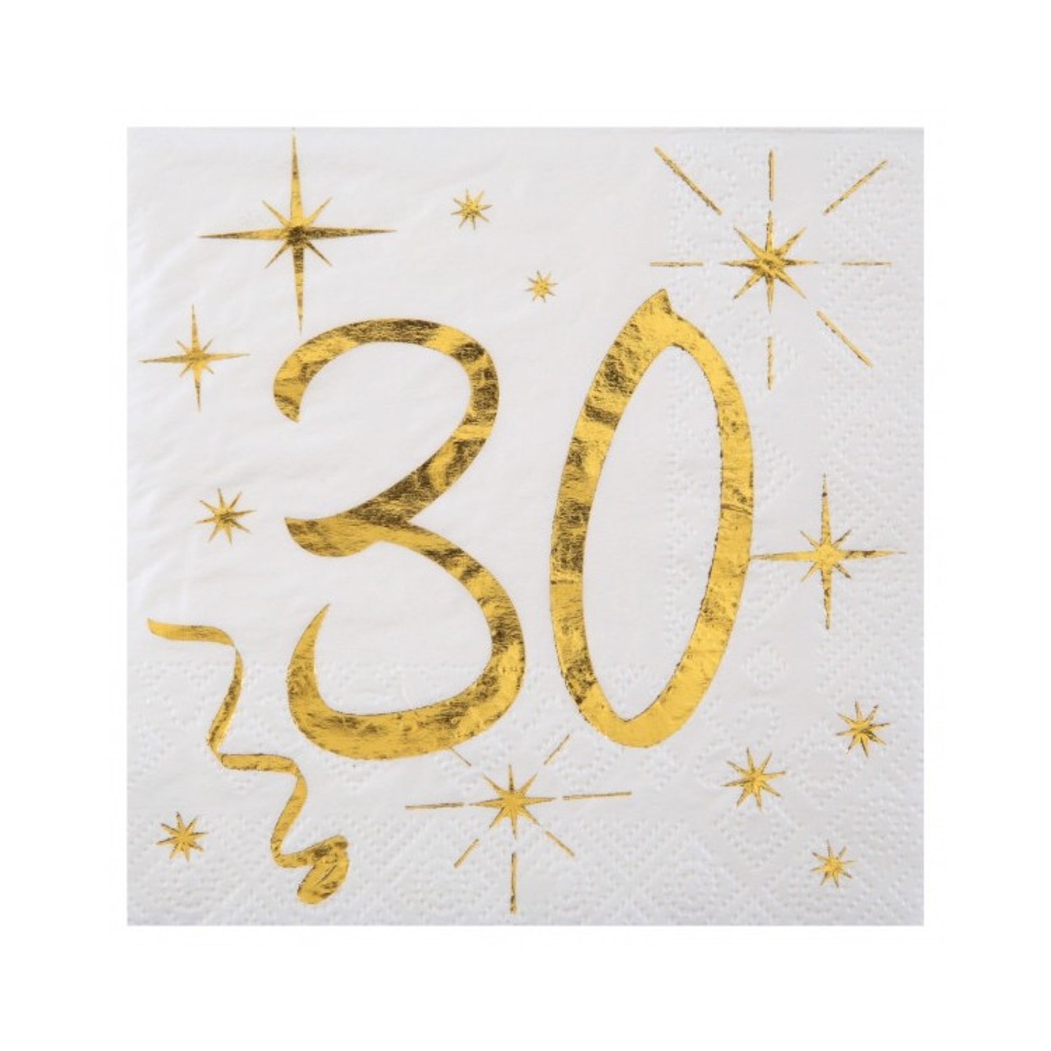Kaffeservetter i vitt och guld med siffran 30 på. Perfekt att använda vid dukningen på just 30års-festen!