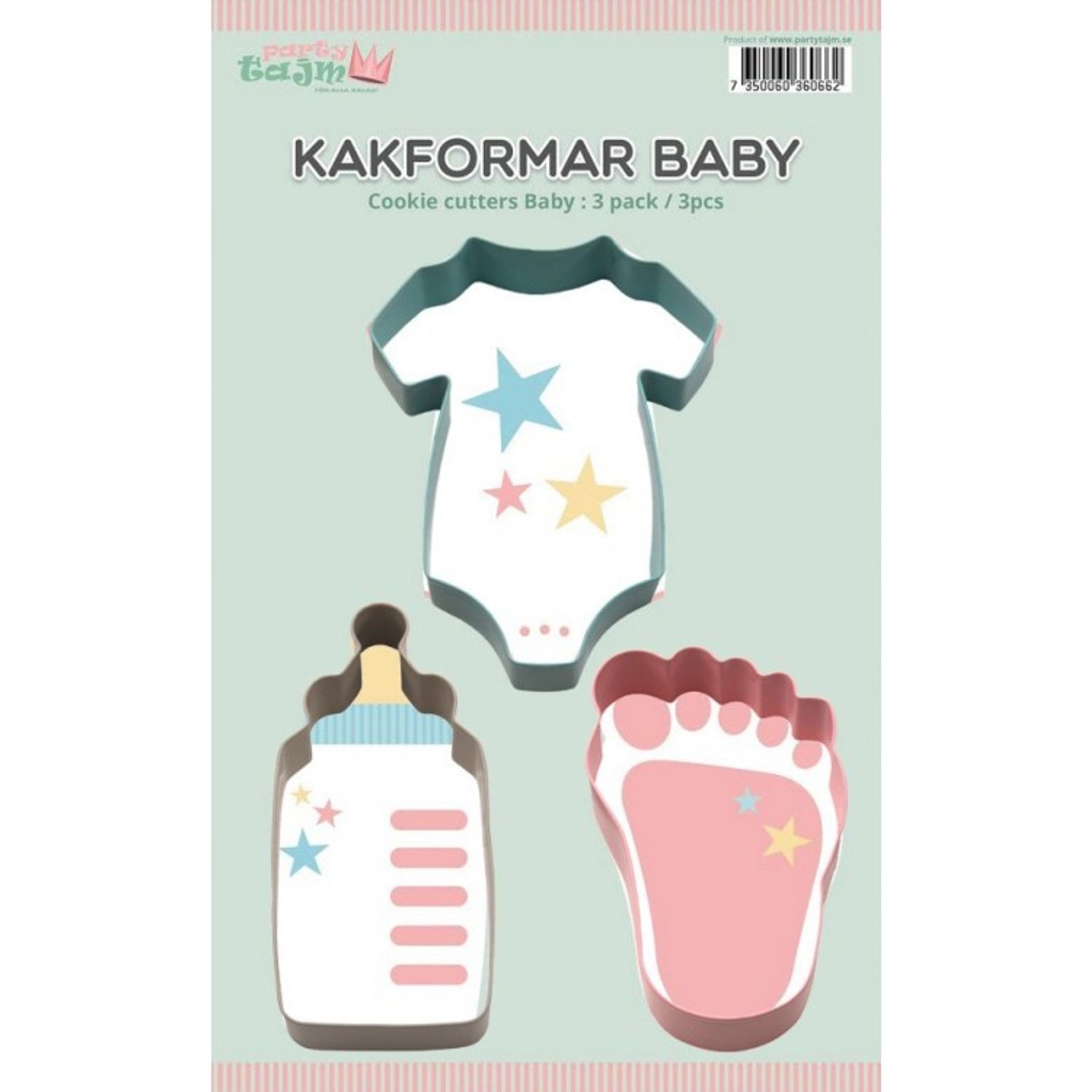 Sötaste kakformarna med motiv av en babybody, fot och nappflaska. Baka goda småkakor med hjälp av dessa praktiska och snygga utstickare. Om du är duktig på att rita och har en stadig hand så kanske du väljer att dekorera dina kakor i passande pastellfärger. För tips om att dekorera kakor läs gärna vår blogg. Storlek ca 10 cm.
