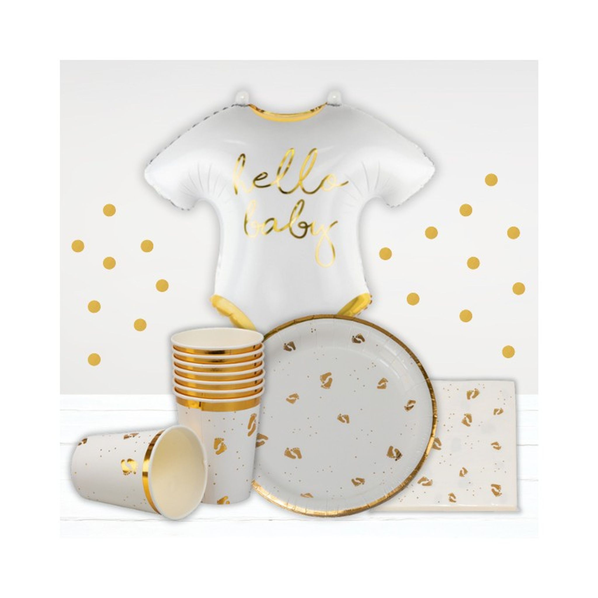 Duka upp för ett alldeles speciellt firande inför bebisens ankomst. Vad passar bättre än en mysig babyshower? Överraska den blivande föräldern med en söt och lyxig dukning i vitt och guld. Dessa artiklar, med babyfötter, är perfekt för ändamålet.