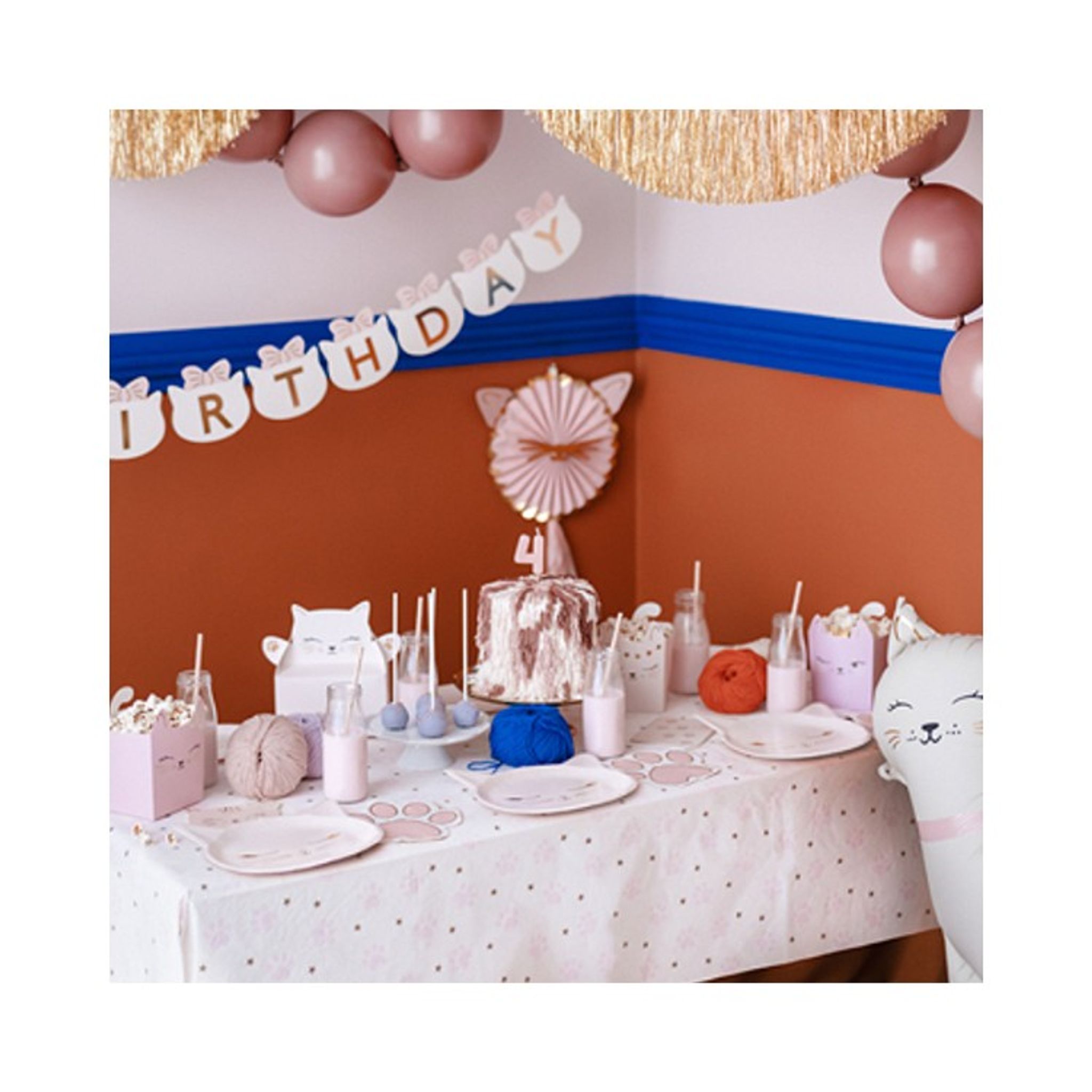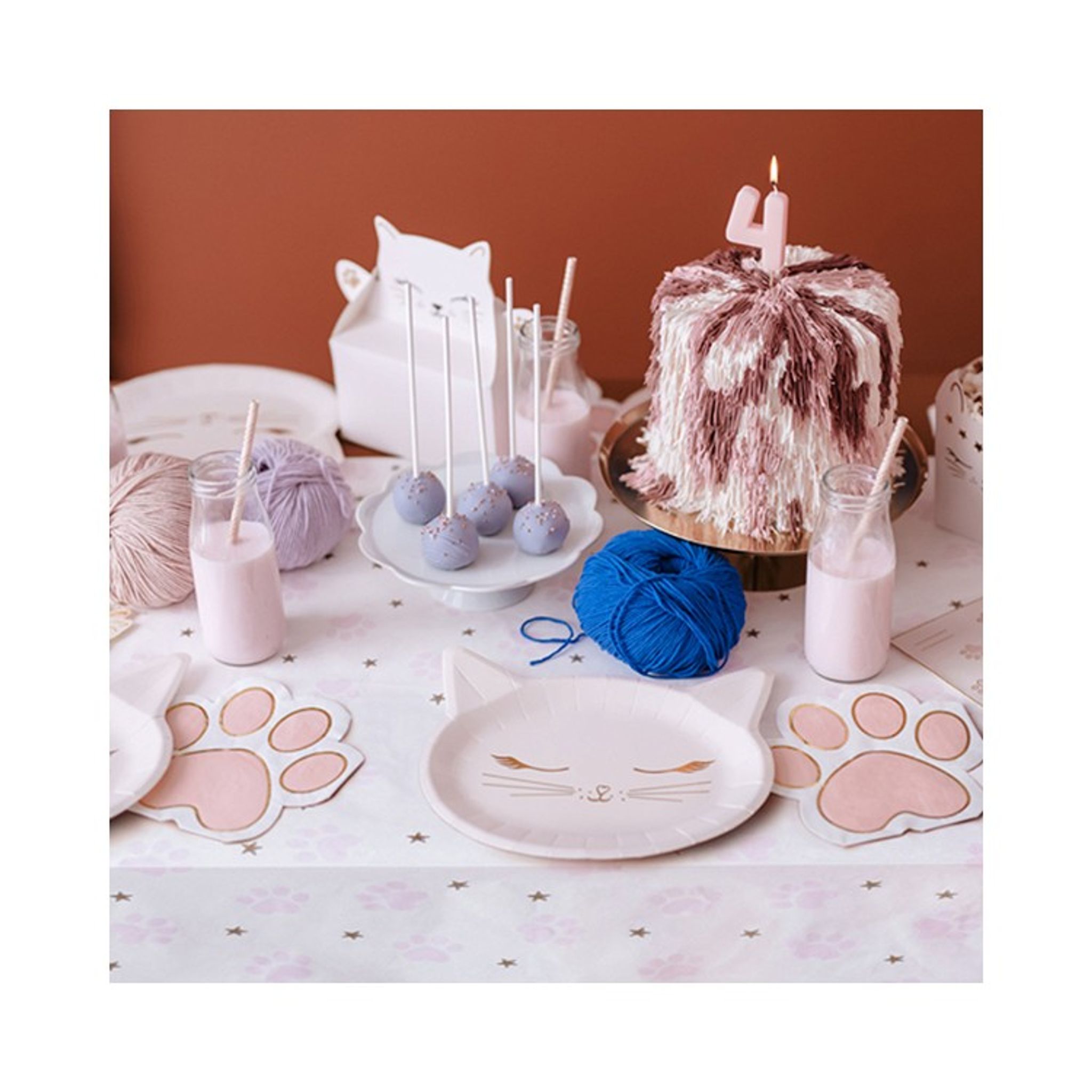 Kolla in, hur gulligt? Ett katt-inspirerat kalaspaket. Med färgerna rosa, vit och guld och de söta mönstren och formerna kan du ha ett bedårande katt-tass kalas. Paketet avses för 6 personer.