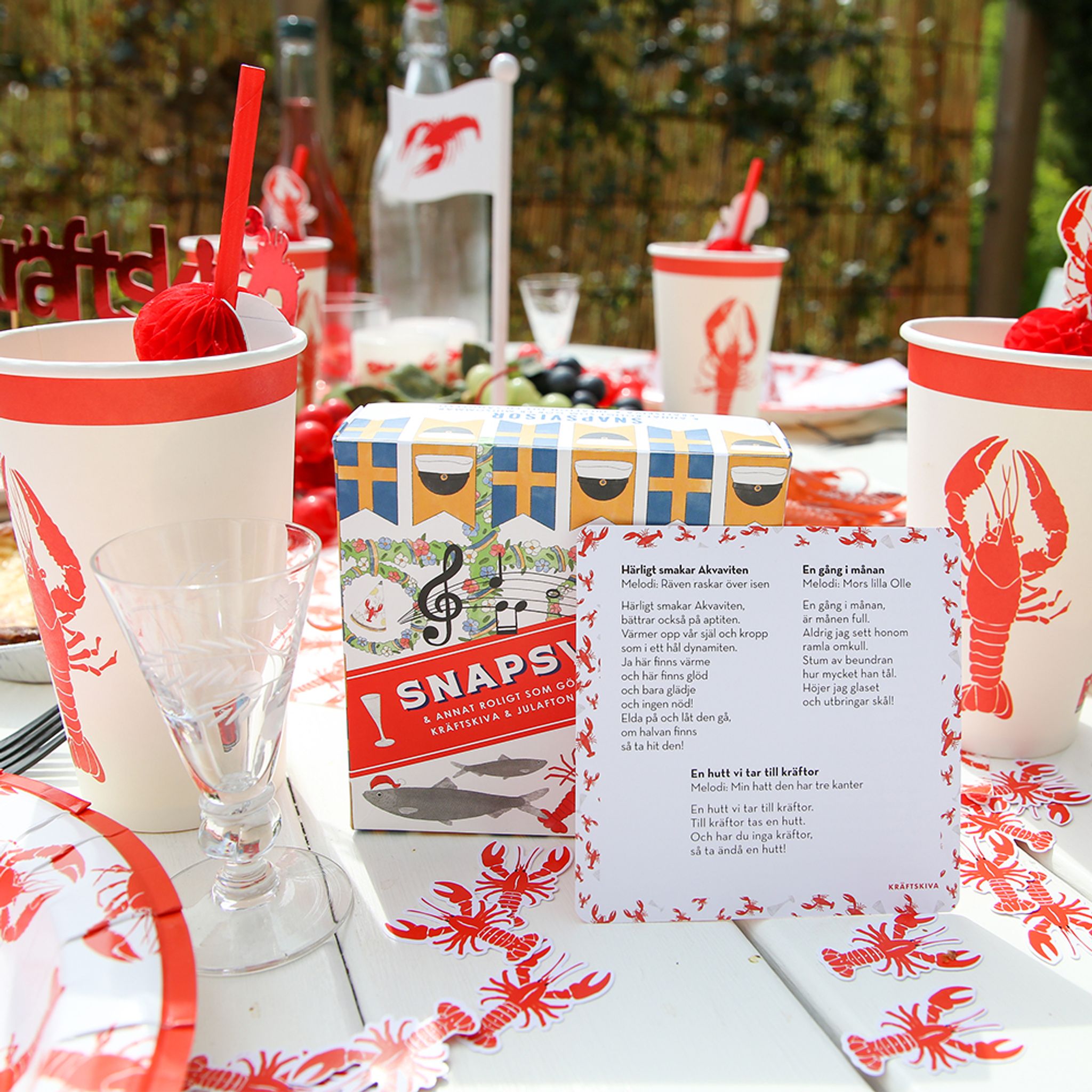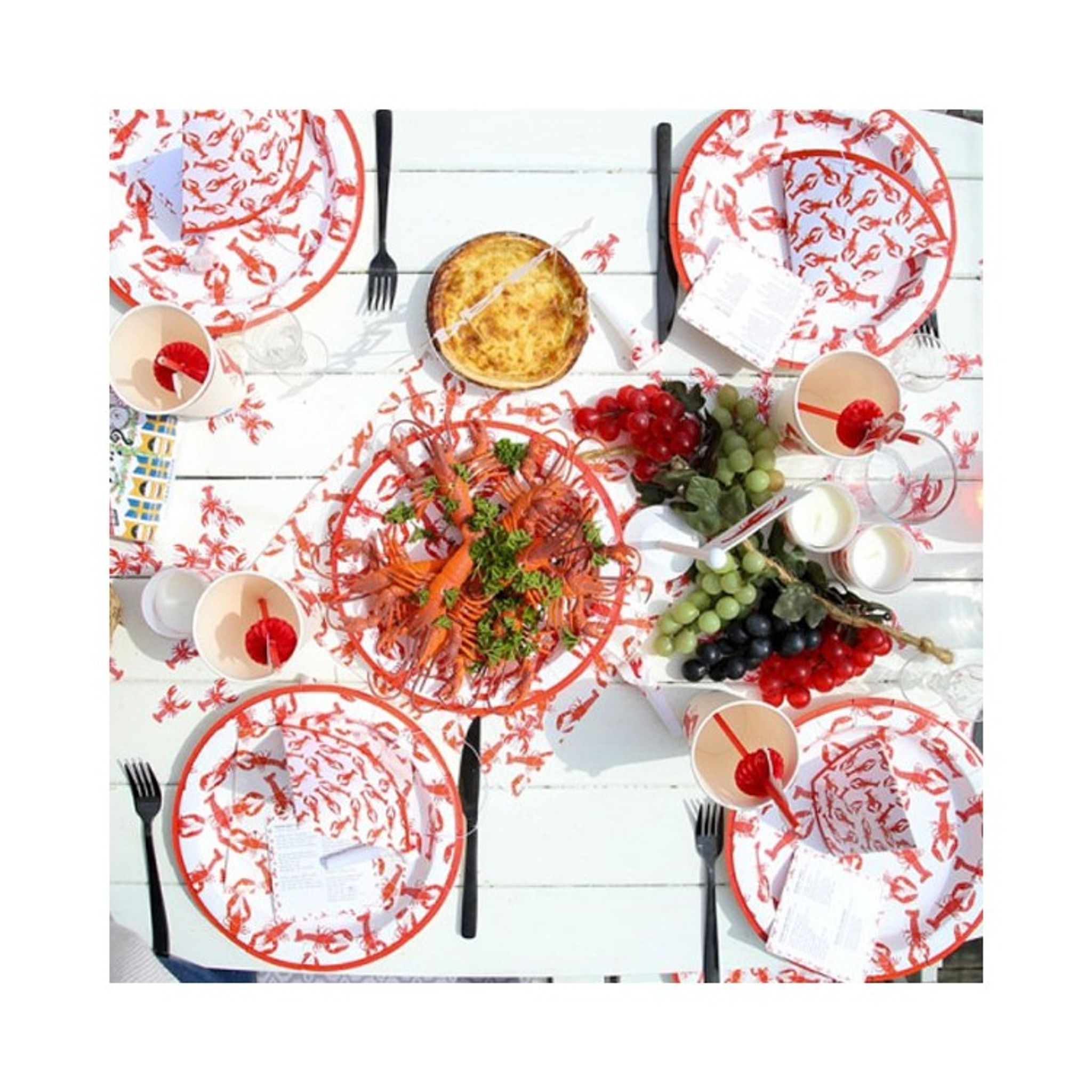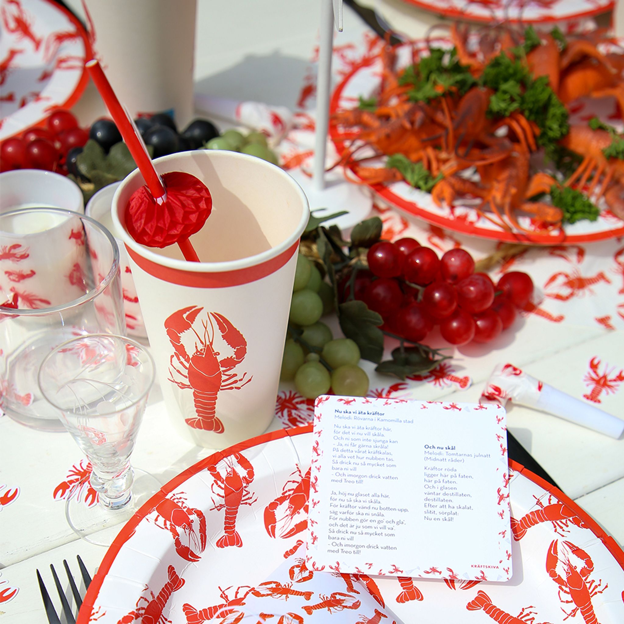 Färdigt kalaspaket med dukningsartiklar och tillbehör till sommarens Kräftskiva! Gör dig redo för kräftfest. Vi har samlat artiklar i vitt och rött som blir utmärkt till ditt firande. Utsmycka dina gäster med partyhattar och haklappar som matchar dukningen - extra genomtänkt och snyggt. Kombinera tillsammans med våra andra dekorationer och tillbehör till just Kräftskiva för att sätta stämningen.