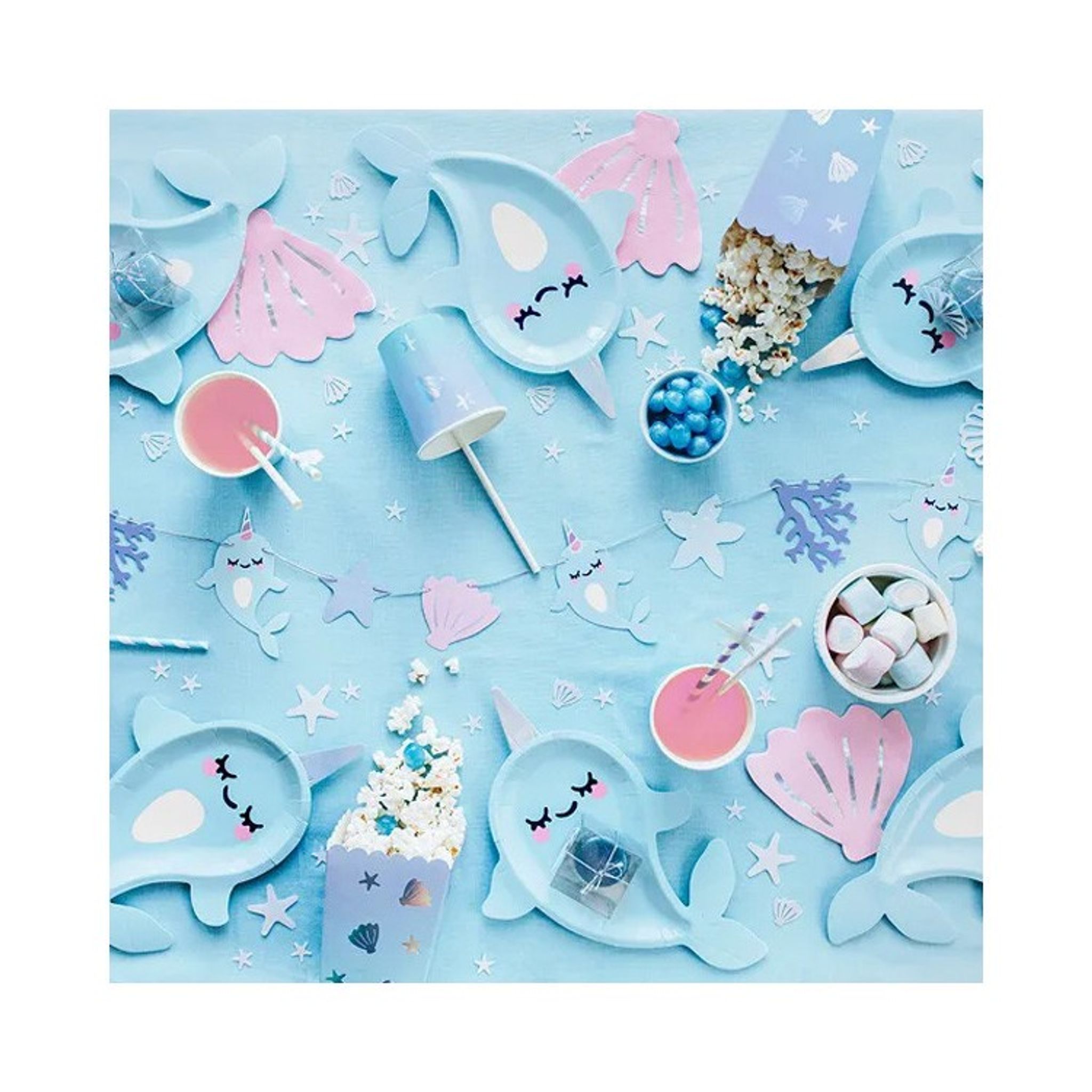 Gulligt kalaspaket Narval för 6 personer i härliga pastellfärger. Kombinera hjärna med andra produkter från tema havet.