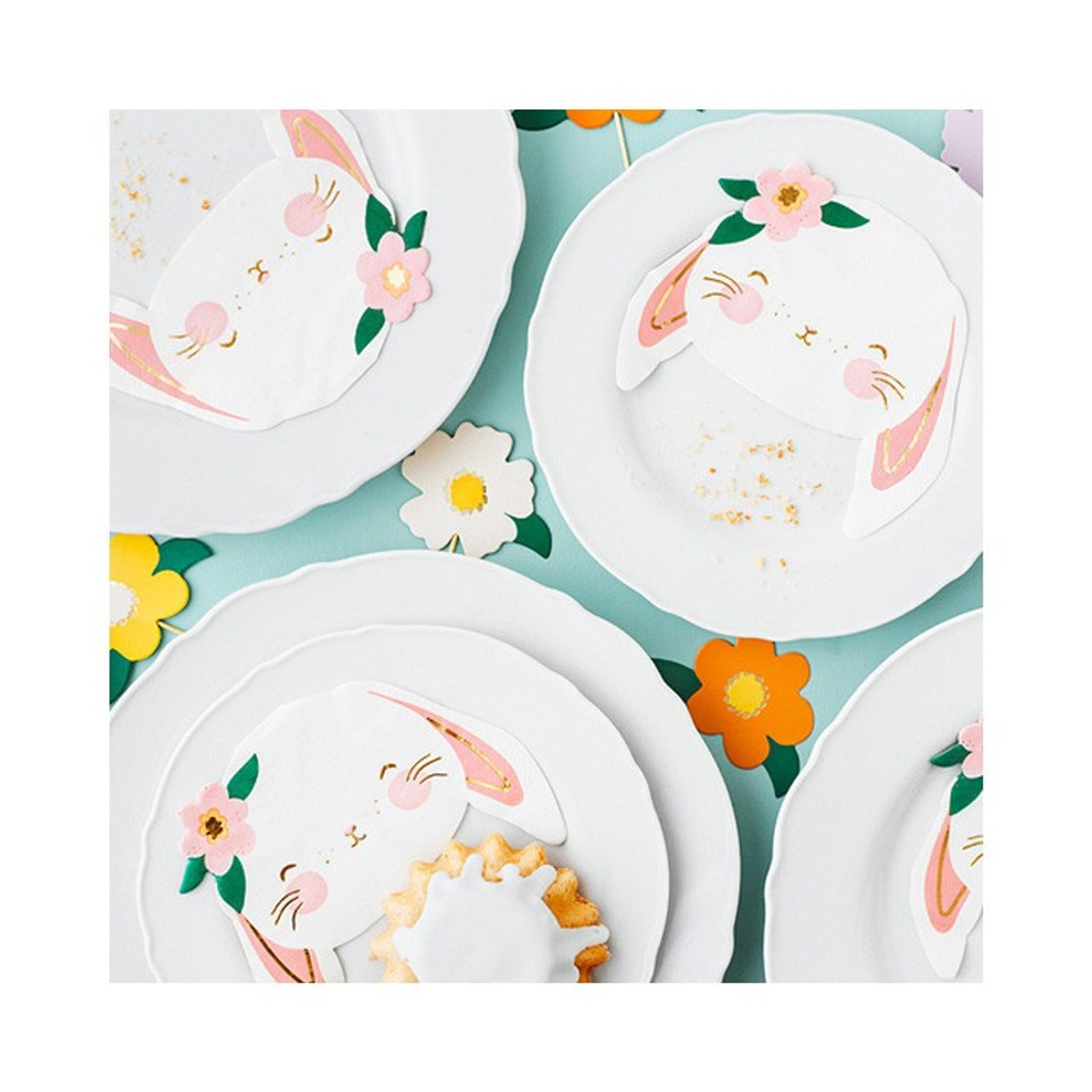 Med de här söta kaninservetterna kan du få till en bedårande dukning både inför barnkalaset med tema kaniner, men också till exempelvis Påsk. Servetterna är ljust ljust gul/beige i botten och pryds av detaljer i folierad guld. Förutom detta har den gulliga kaninen blomster på huvudet samt ljusrosa detaljer. En servett som gör vilken dukning som helst extra söt!