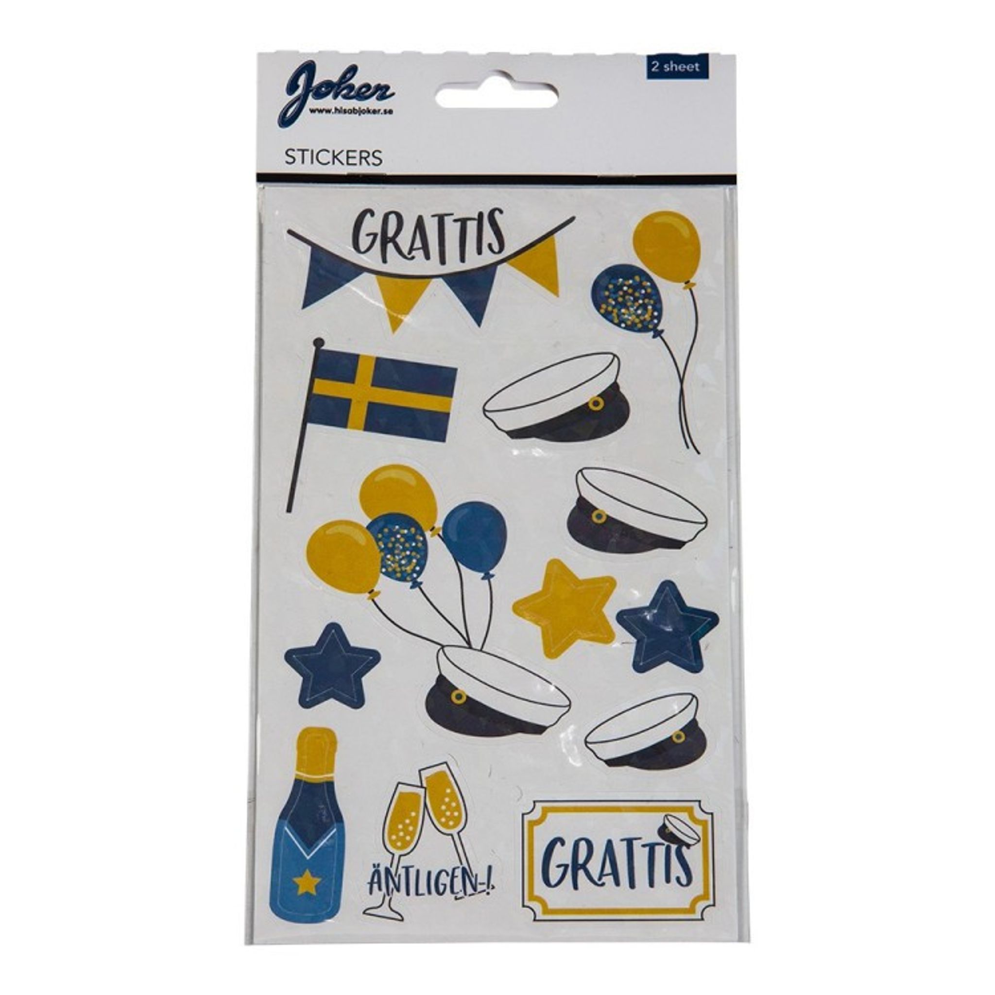 Dessa klistermärken med studentmotiv kan enkelt piffa upp inbjudningskortet, placeringskortet eller det enfärgade presentpappret inför studenten. Klistermärkena är allt från blågula ballonger till studenthattar och svenska flaggan.