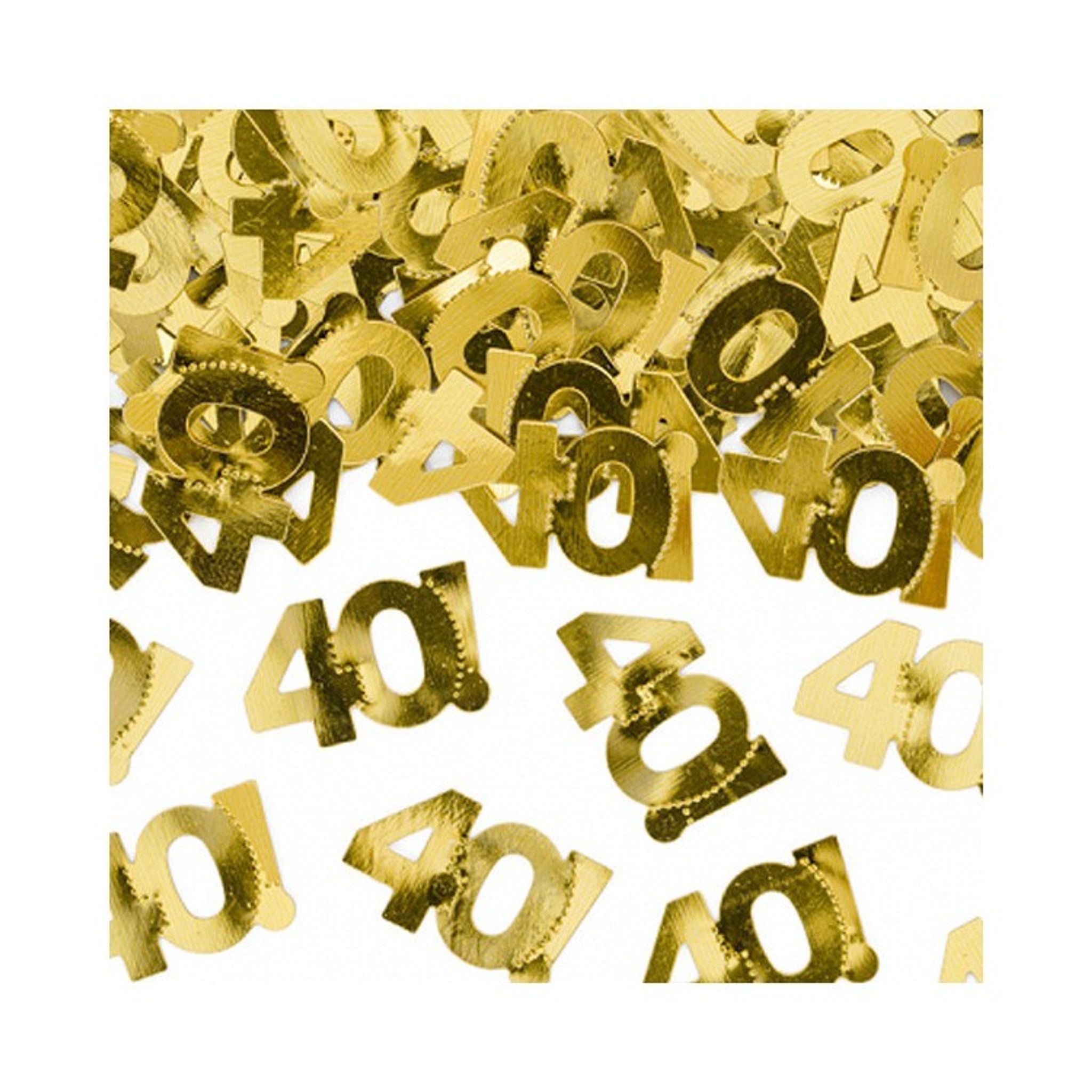Konfetti med siffran 40! i guld. Perfekt att strö över kalasbordet när det vankas 40års-fest! Skapar genast en festligt känsla på dukningen. Förpackningen innehåller 15g konfetti.