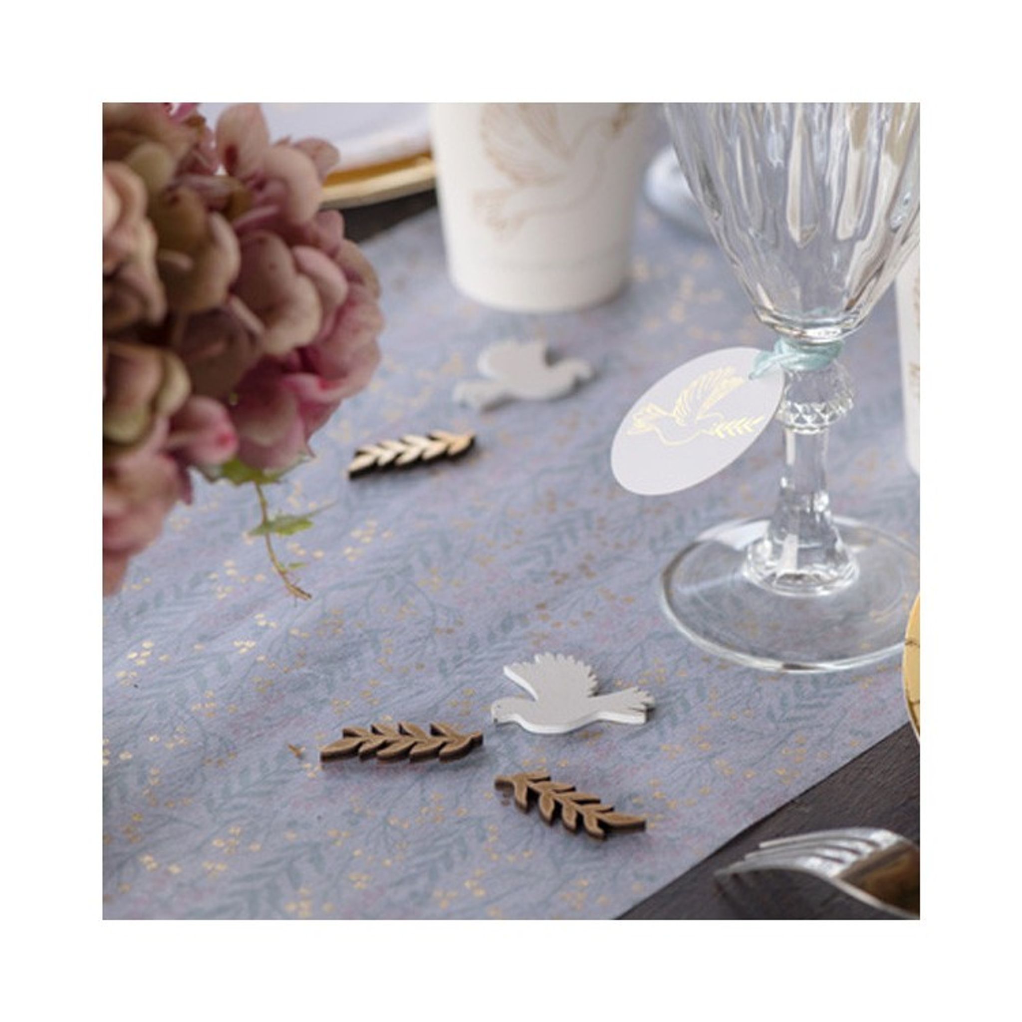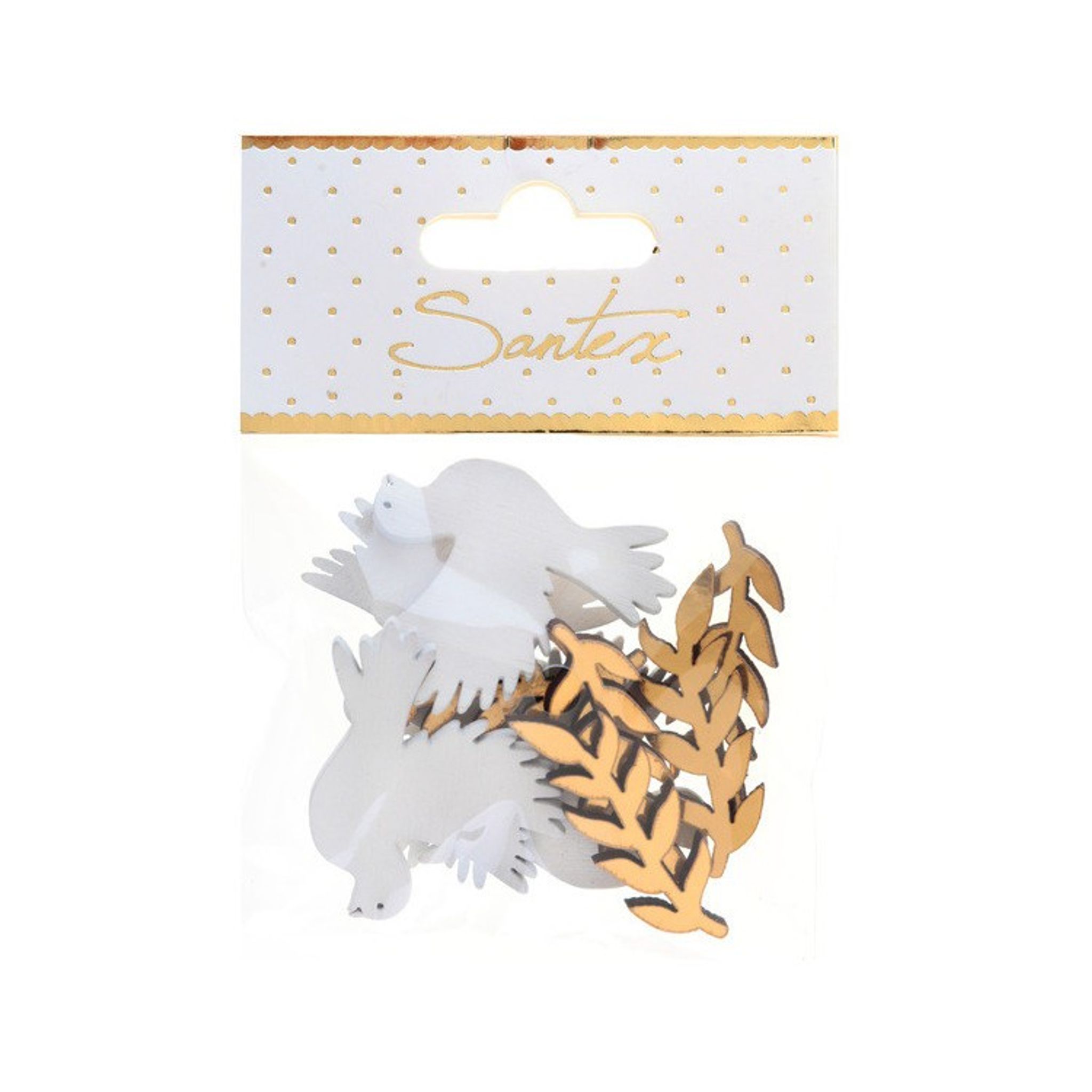 Konfetti med duvor och kvistar.