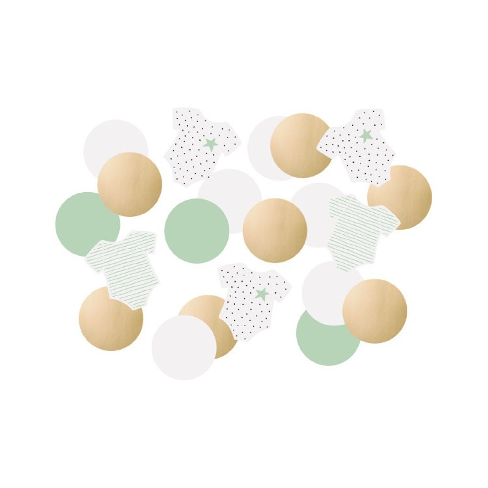 Duka upp med den här härliga mixen konfetti till babyshowern, dopet eller gender reveal partyt. Mixen innehåller cirklar i vitt, folierad guldfärg och mint samt babybodies med mönster. En vacker bordsdekoration!