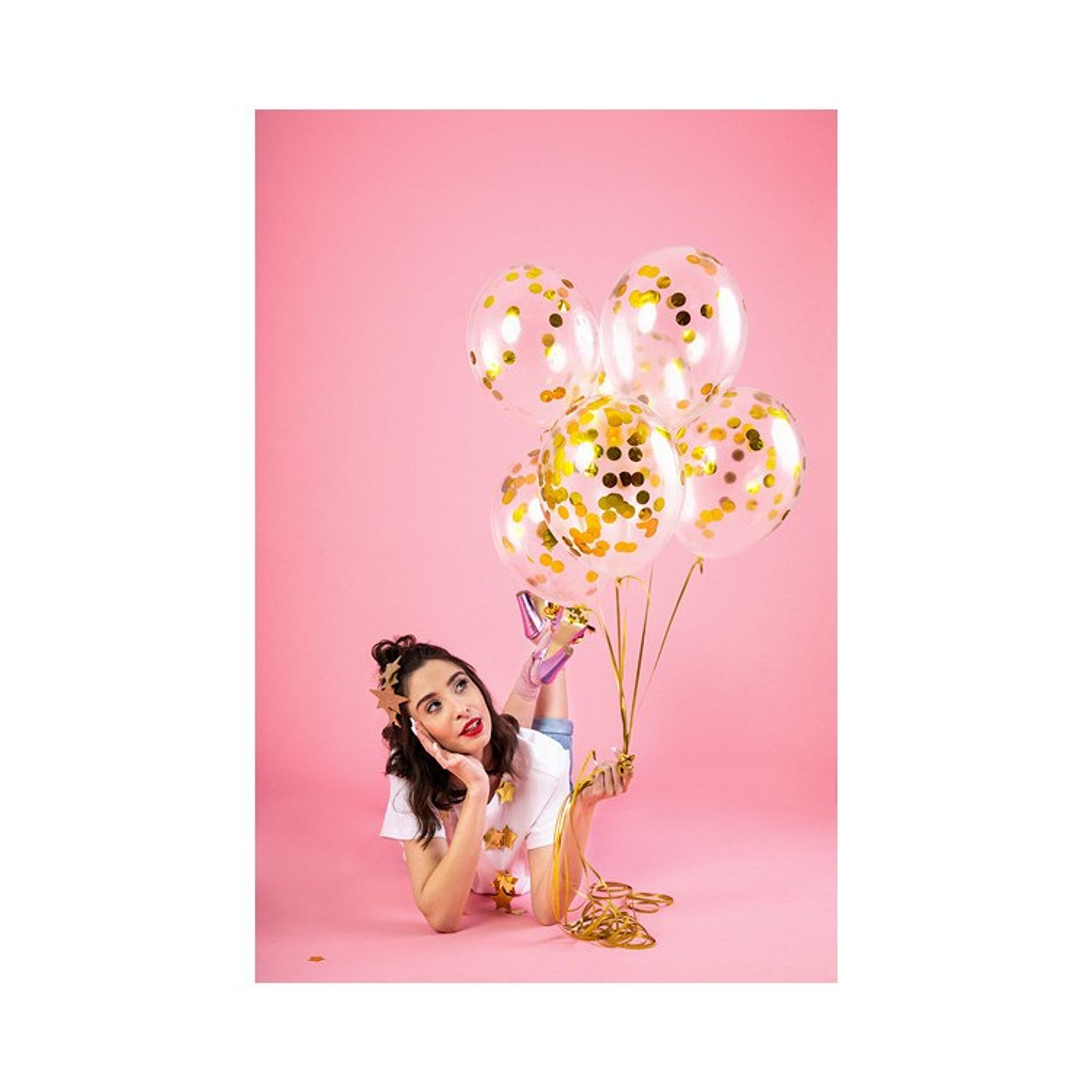6 st transparenta ballonger som du själv fyller med tillhörande guldkonfetti. Dessa ger ballongerna en extra snygg och exklusiv känsla. Perfekt att dekorera med på alla festliga tillställningar. Ballongerna är av heliumkvalitet och storleken är ca 30 cm när de är uppblåsta.