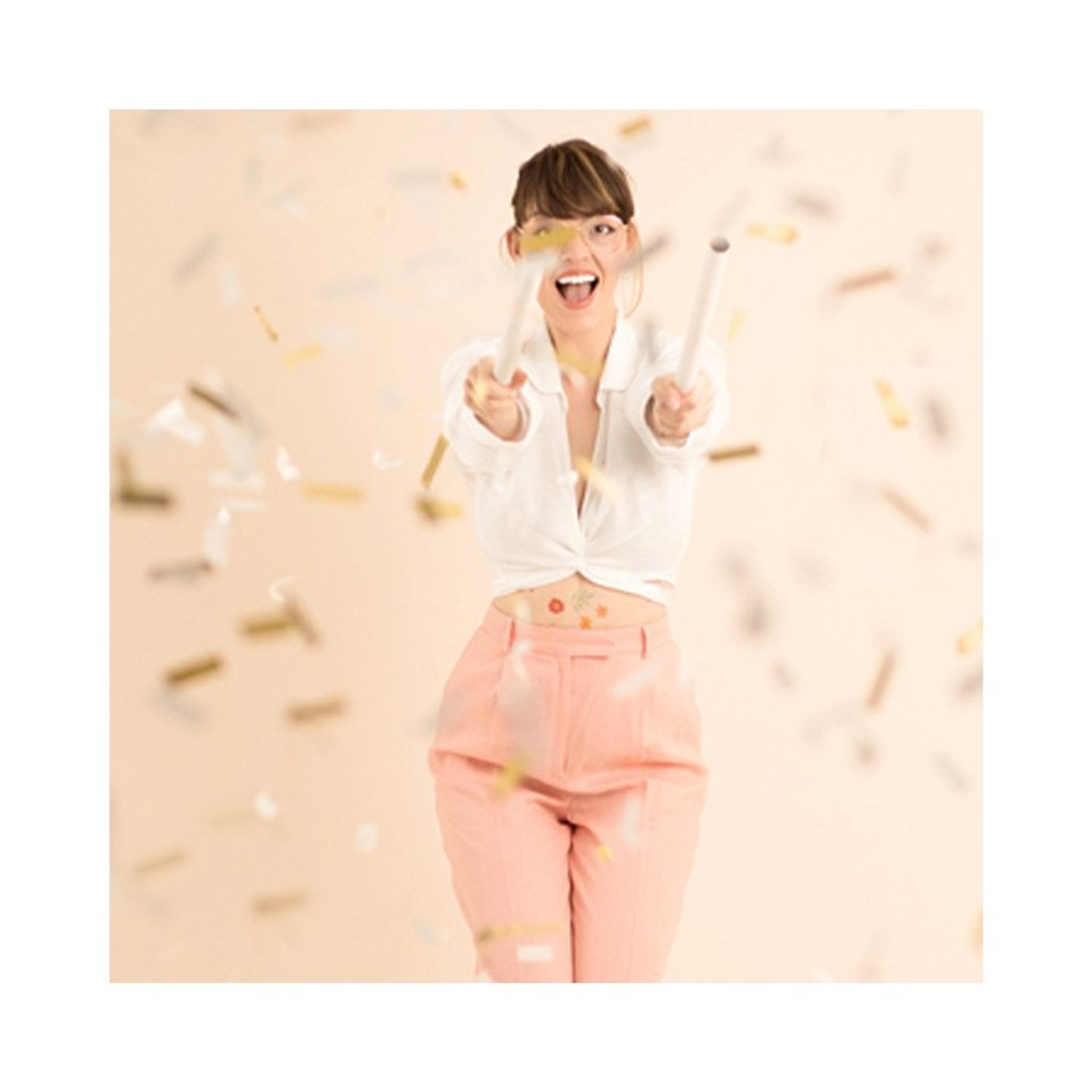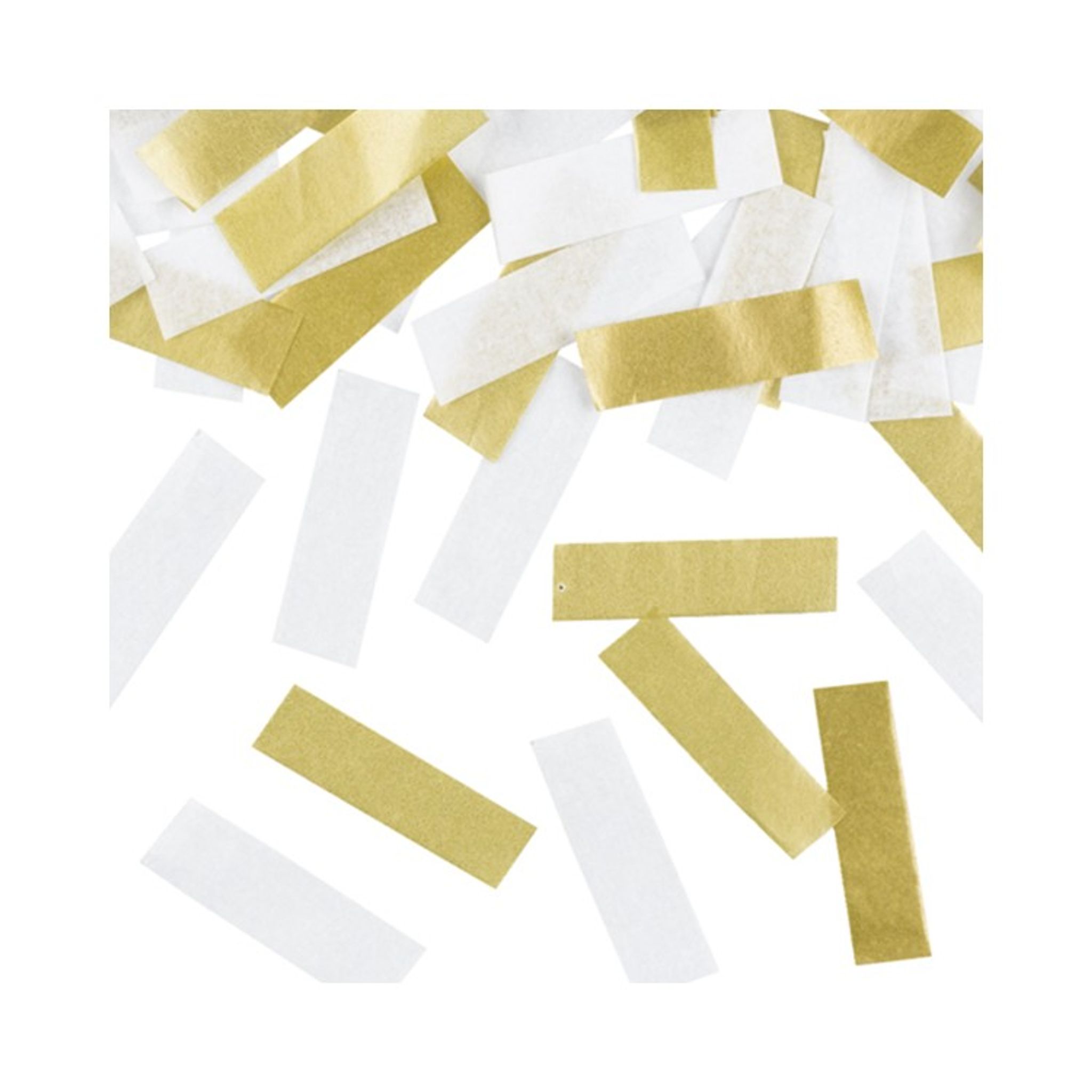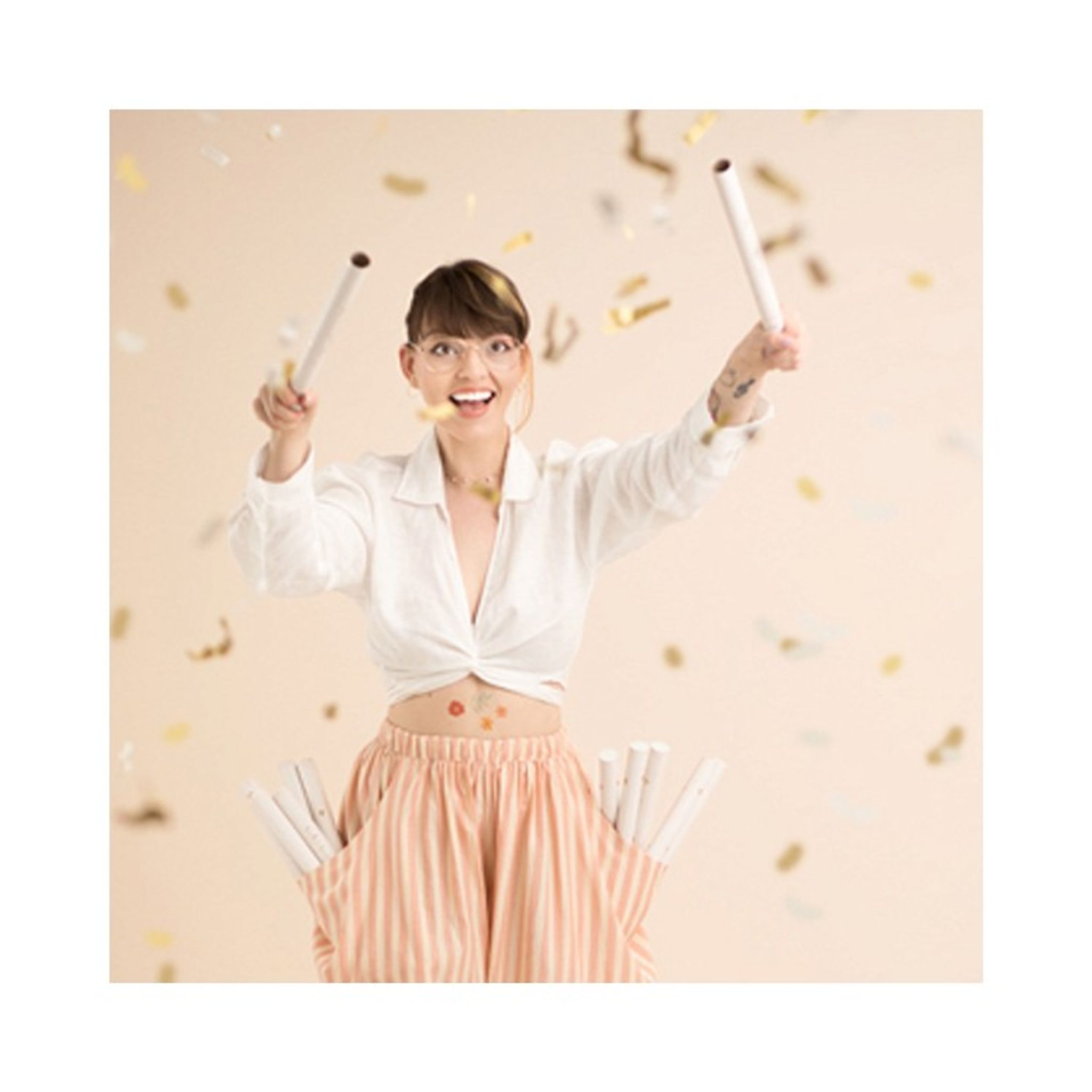 För att avfyra konfettin behöver du ta bort plasttoppen och vrida röret. Konfettiremsorna är i färgerna vitt och guld.