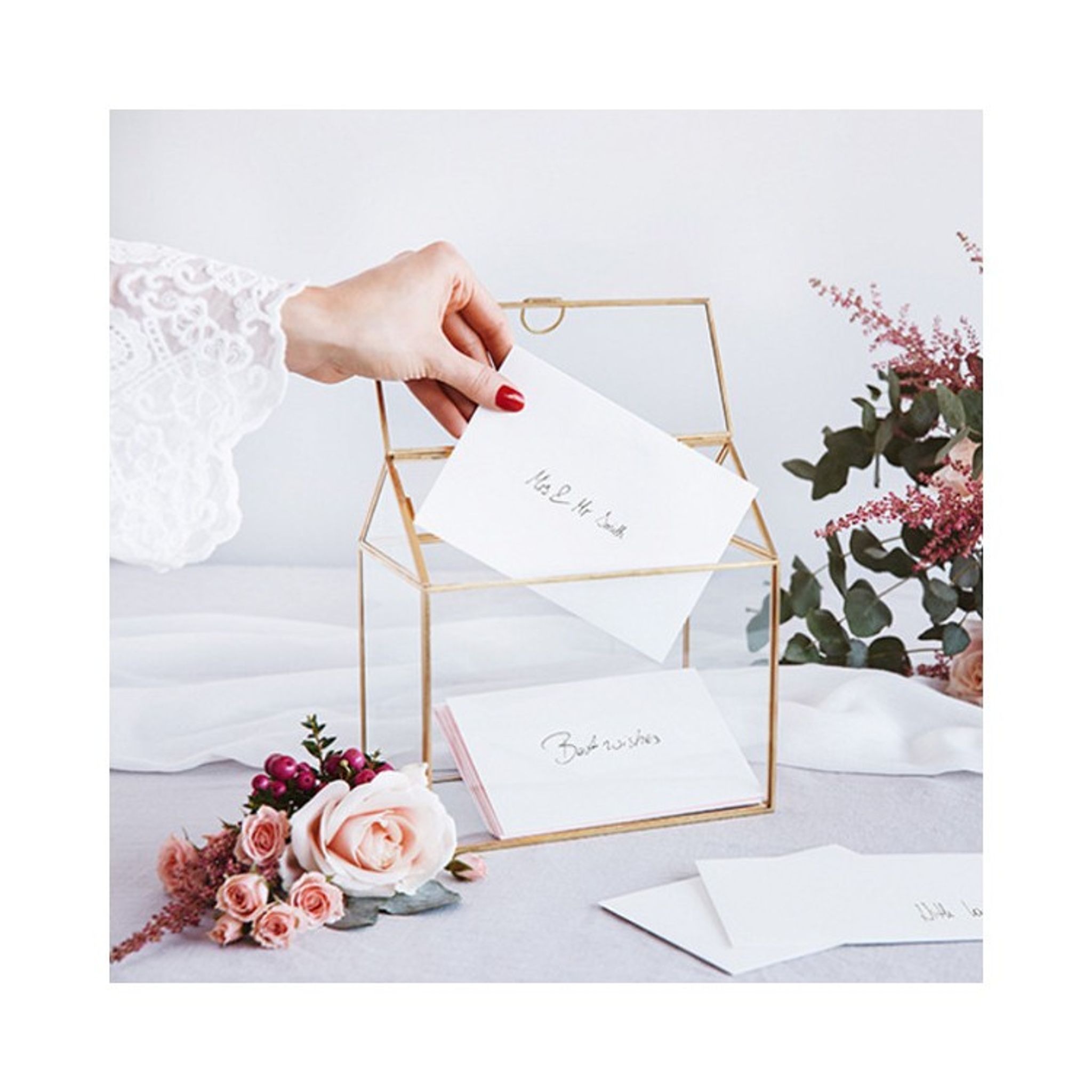Glashus att förvara era önskningar eller andra gåvor som tex presentkort i. Korthuset är av glas och har guldfärgade dekorationer och kanter. Storlek: 13x21x21 cm.