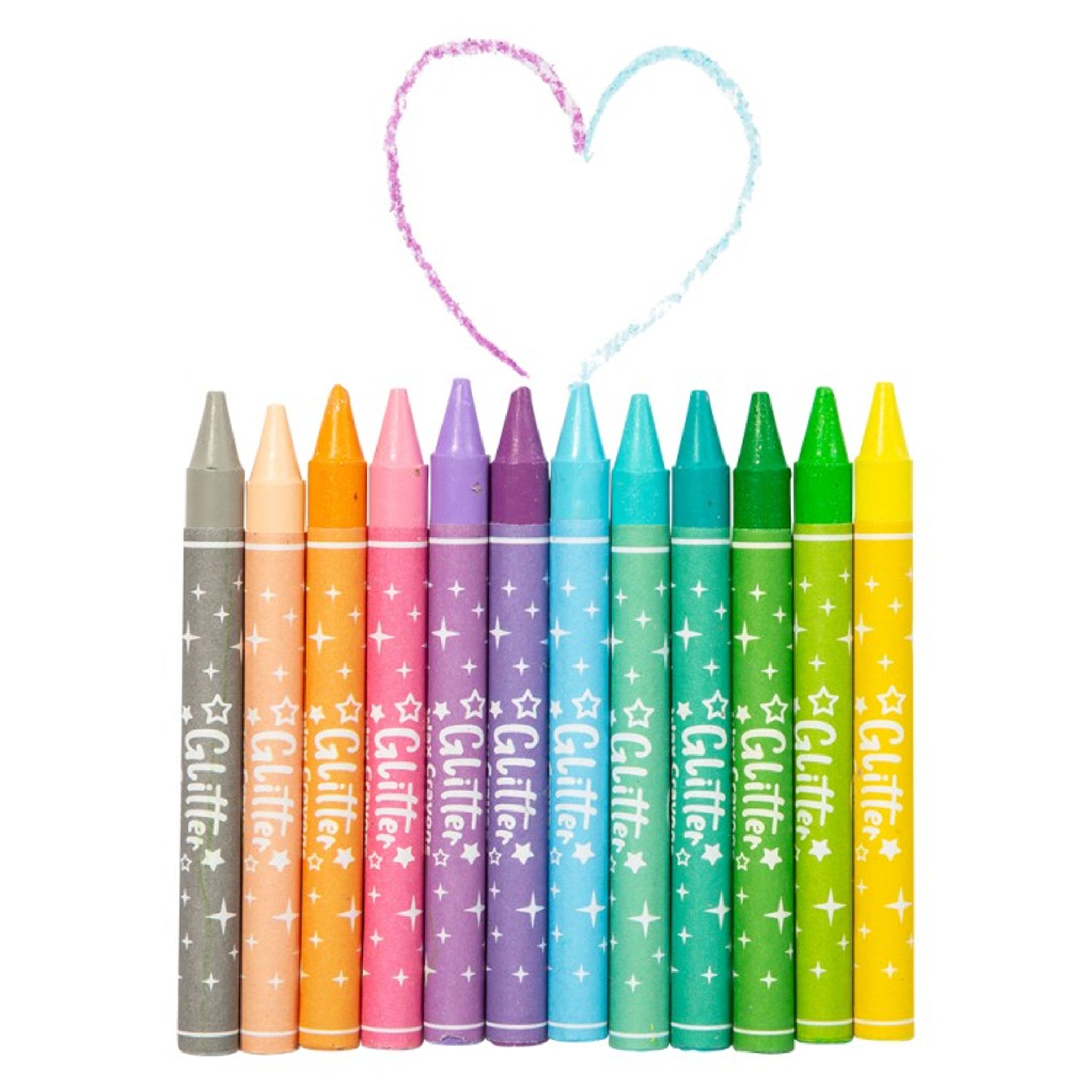 Vaxkritor med glitter i 12-pack. Tillverkade av paraffin. Inte lämplig för barn under 3 år på grund av smådelar, kvävningsrisk.