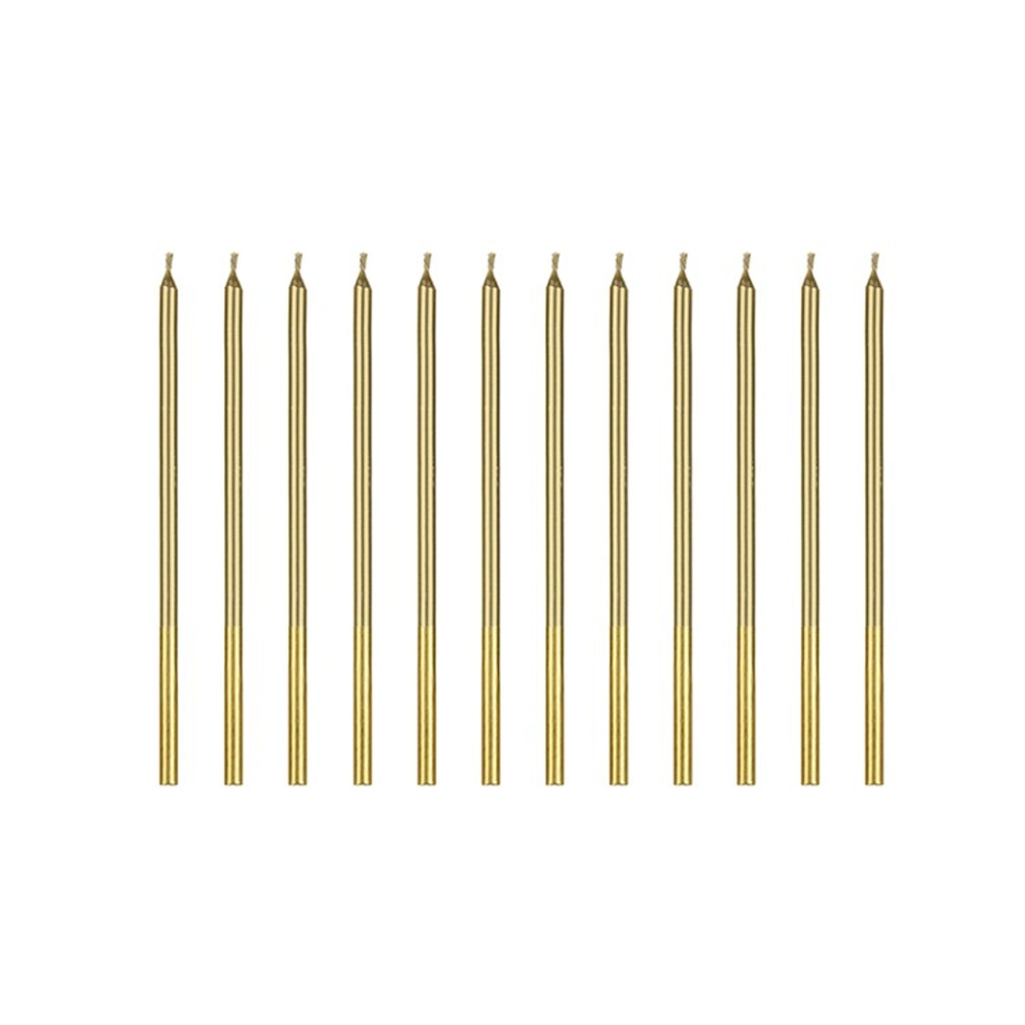Tjusiga långa tårtljus i guld. Det finns en färgbrytning längst ned på ljusen som ger en snygg effekt. Storlek: 14 cm Förpackningen innehåller 12 stycken ljus.