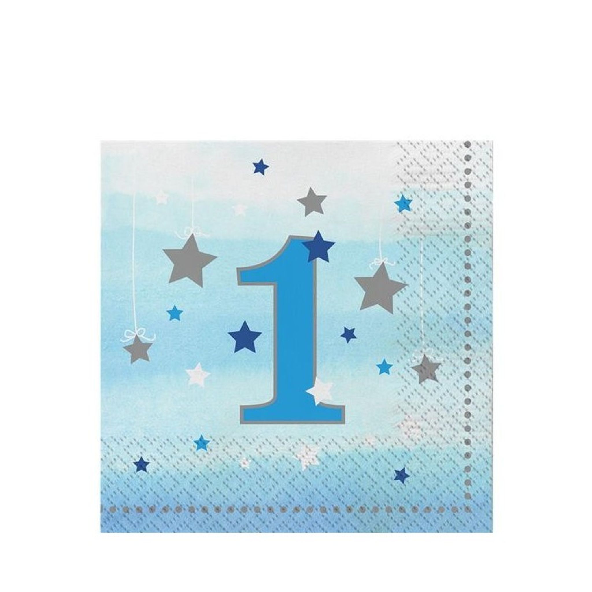 16 st lunchservetter i fin ljusblå färg med stjärnor och en blå 1. Duka snyggt med servetter till 1 årskalaset som skall gå i blått. Kombinera gärna våra övriga kalastillbehör i samma serie och du skapar snabbt och enkelt en fin dukning till den lilla 1 åringens första födelsedagsfest. Storlek 33 x 33 cm i utvikt mått