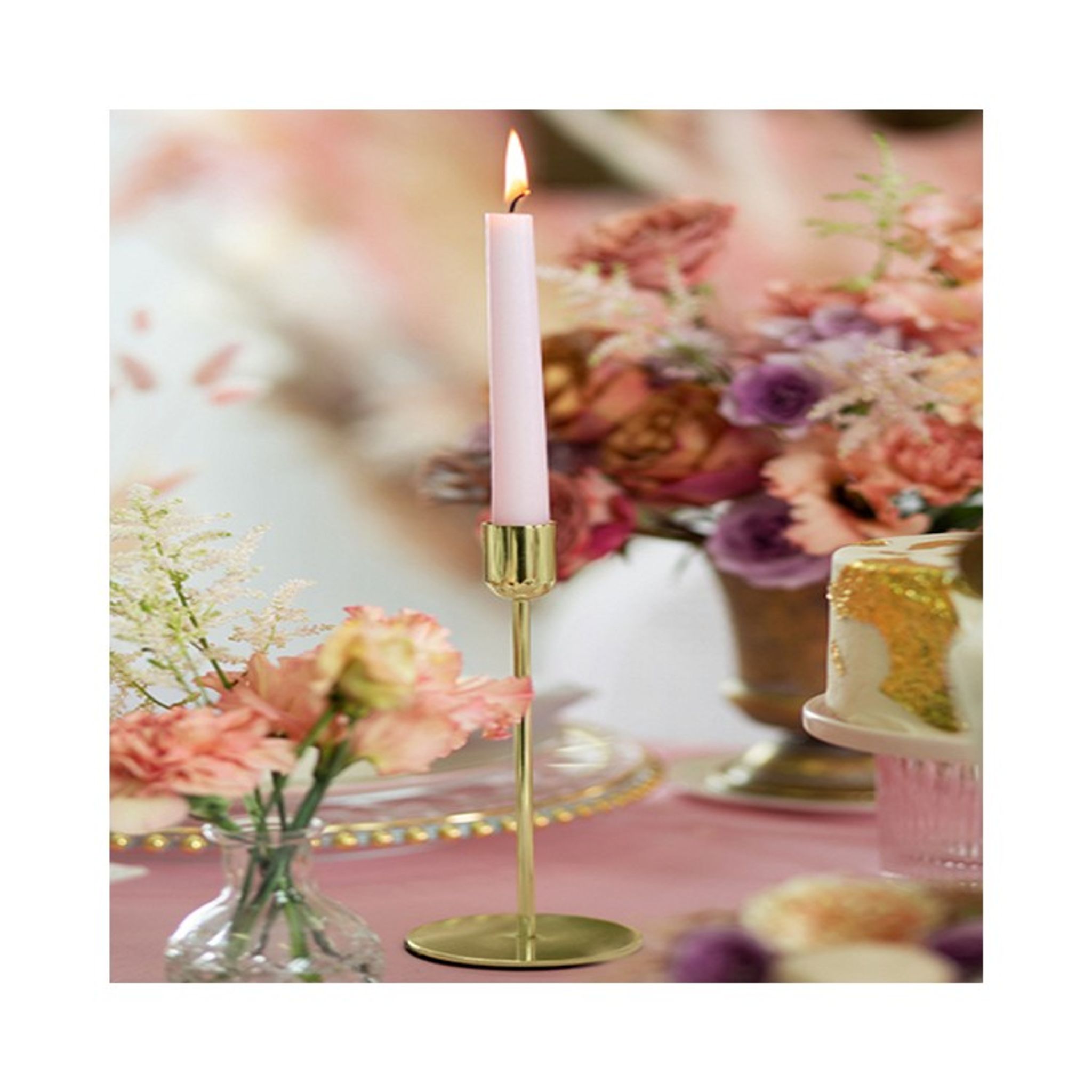 Guldfärgad metall-ljusstake som är tjusig till bordsdekoration vid dukning.