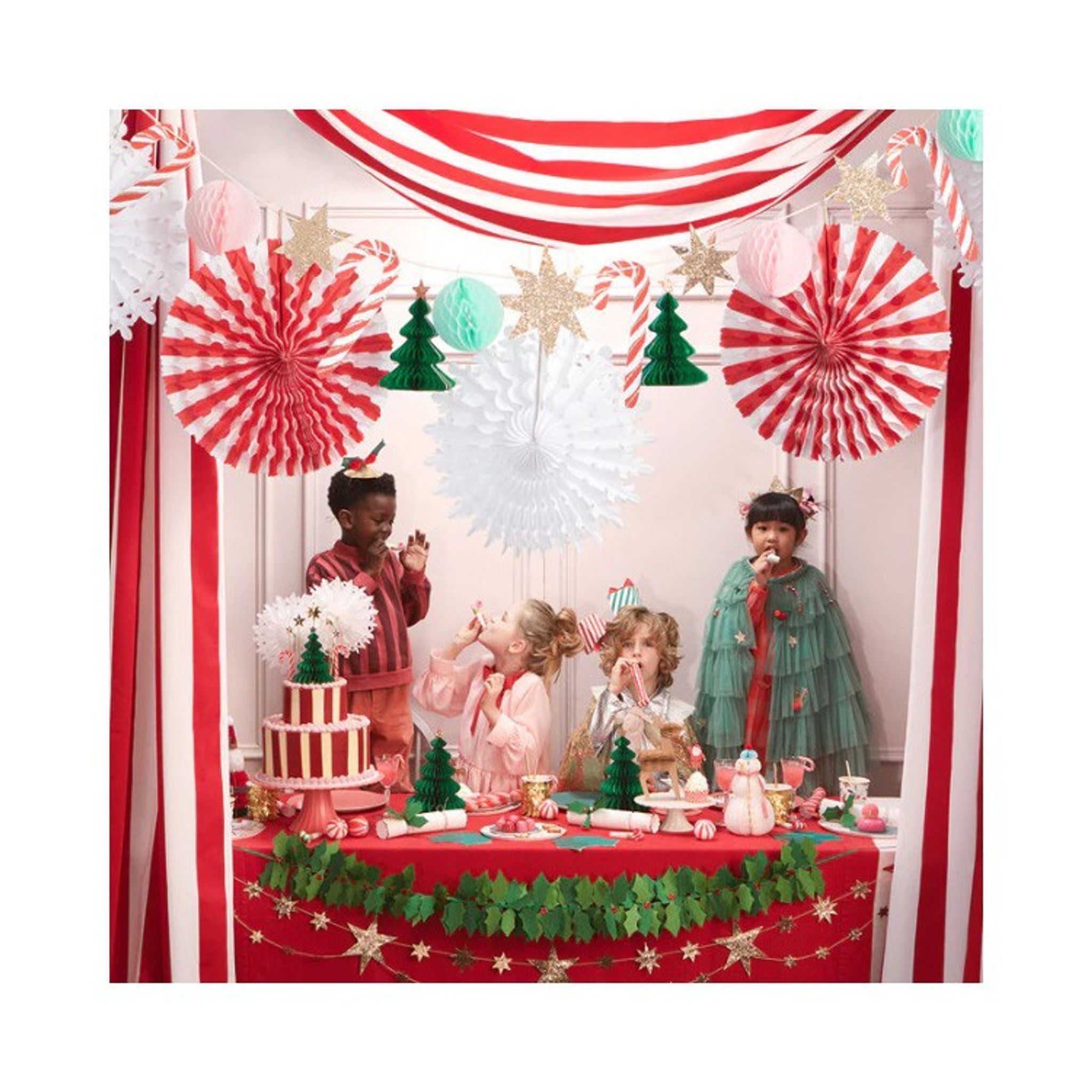 Vad vore julen utan dekorationer? Den här stämningsfulla girlangen med honeycomb dekorationer, polkakäppar och glittriga stjärnor blir fin ovanför buffébordet eller julbordet.
