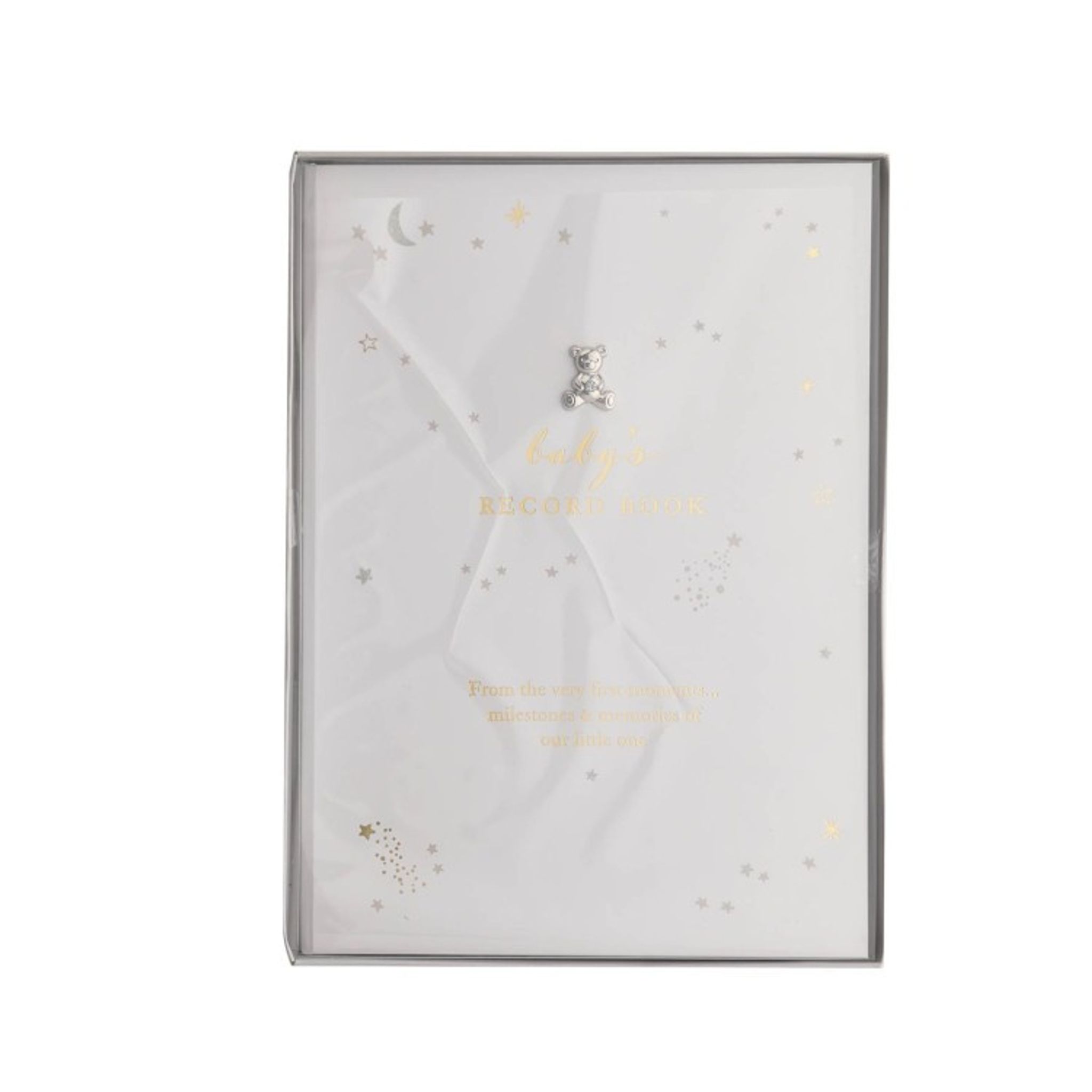 Mitt första album med silvriga detaljer och vitt sidenband. Fint album med milstolpar, månad till månad, med utrymme för bilder och minnen. Från babyns födelse till första födelsedagen. Fin Babyshower-present till den blivande föräldern eller baby present till det nyfödda barnet.